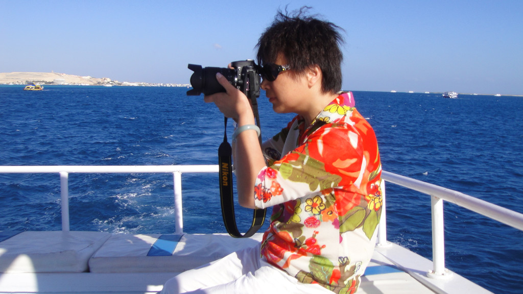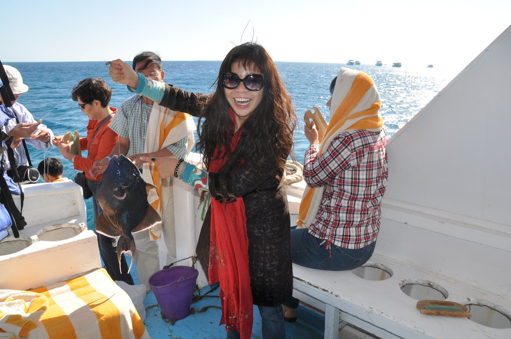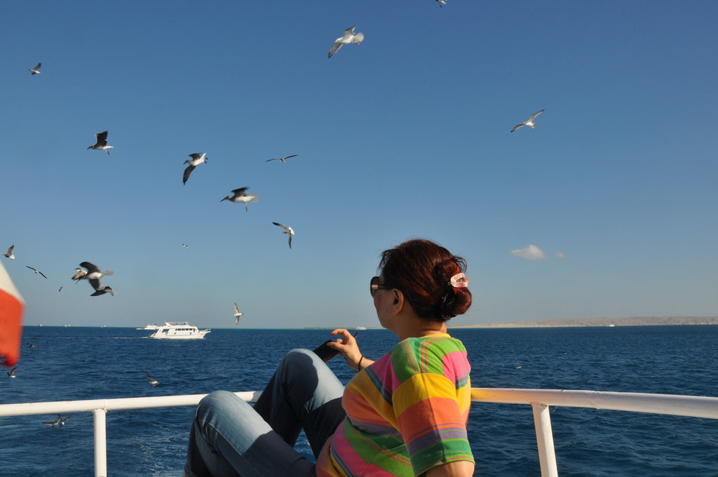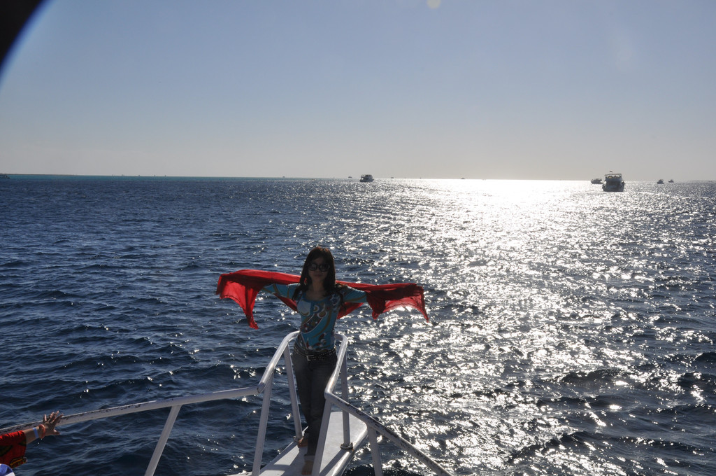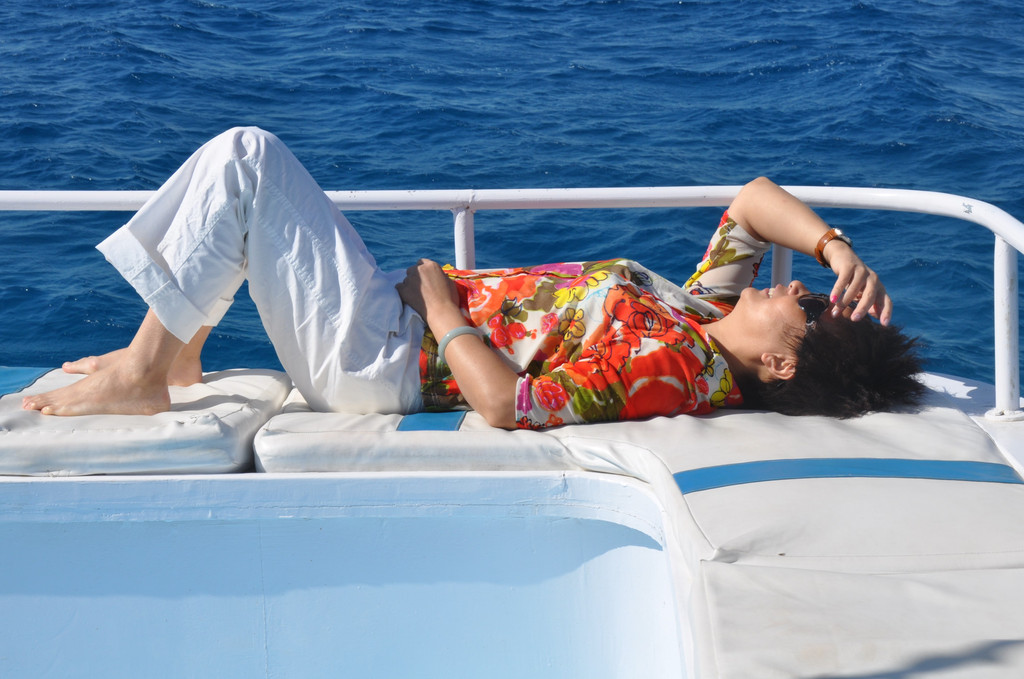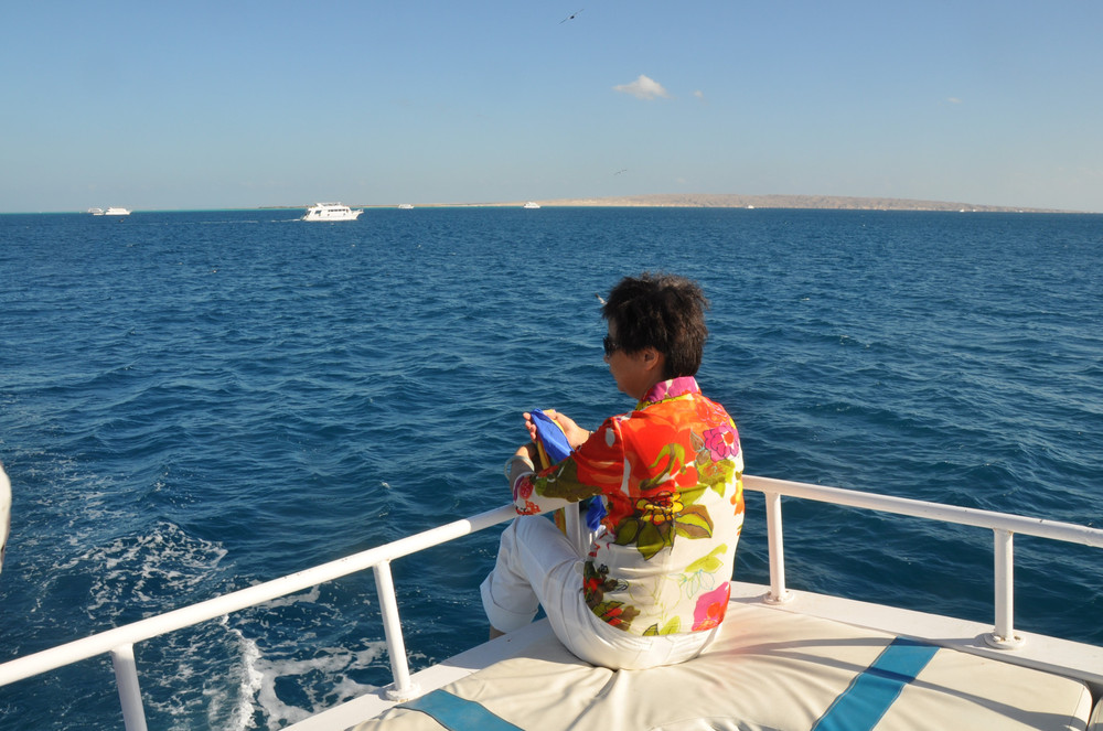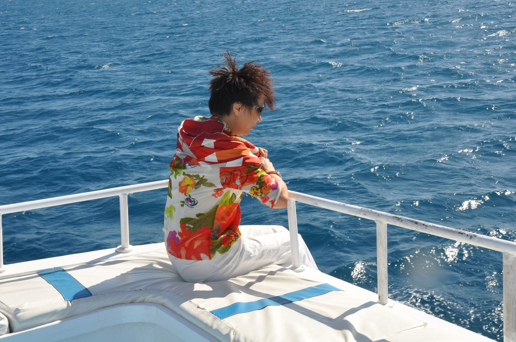 说实话,刚潜入海底时是无畏而冲动的,对身边游过的斑斓鱼群新鲜、惊喜,看摇曳的海草,触摸深海长满苔藓的礁石,总之,好奇海底的一切。可时间一久,对于口里含着氧气咬管用嘴呼吸就很不习惯了,一不小心就会用鼻子呼吸或者喝一大口海水,于是向教练竖着大拇指(请求上浮的动作)浮出水面,来到甲板上休息。此时,手机铃响,是远在国内的老母亲打来电话,说从新闻里看到有旅游团在埃及红海潜游被鲨鱼攻击,让我一定不要下海,要注意安全。接完电话之后,当我再次下海,就已经变成了惊弓之鸟,被鲨鱼攻击的消息挥之不去,海里所有游动的生物,仿佛都是鲨鱼,潜海的兴奋和乐趣荡然无存,只好上艇晒太阳、拍照。