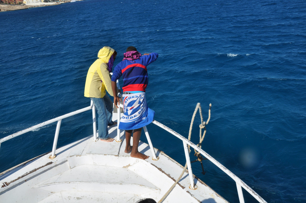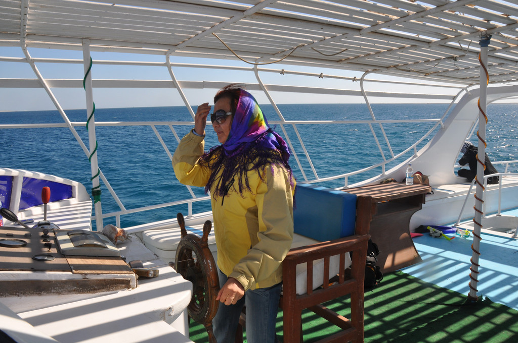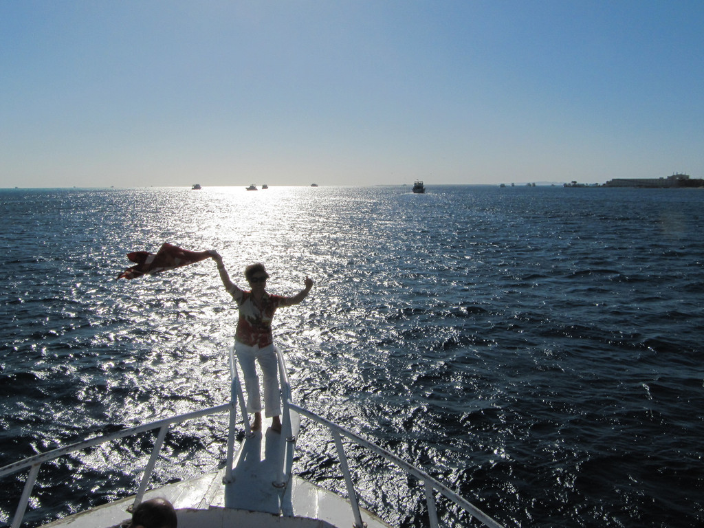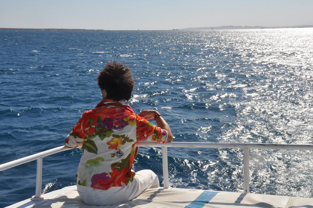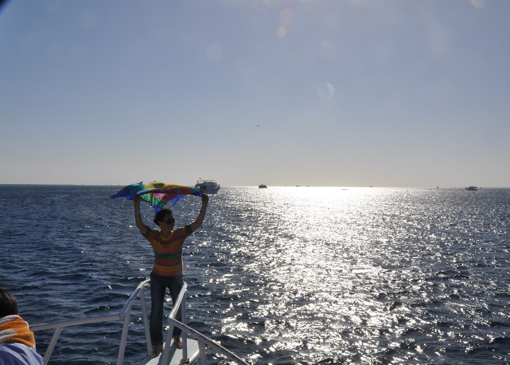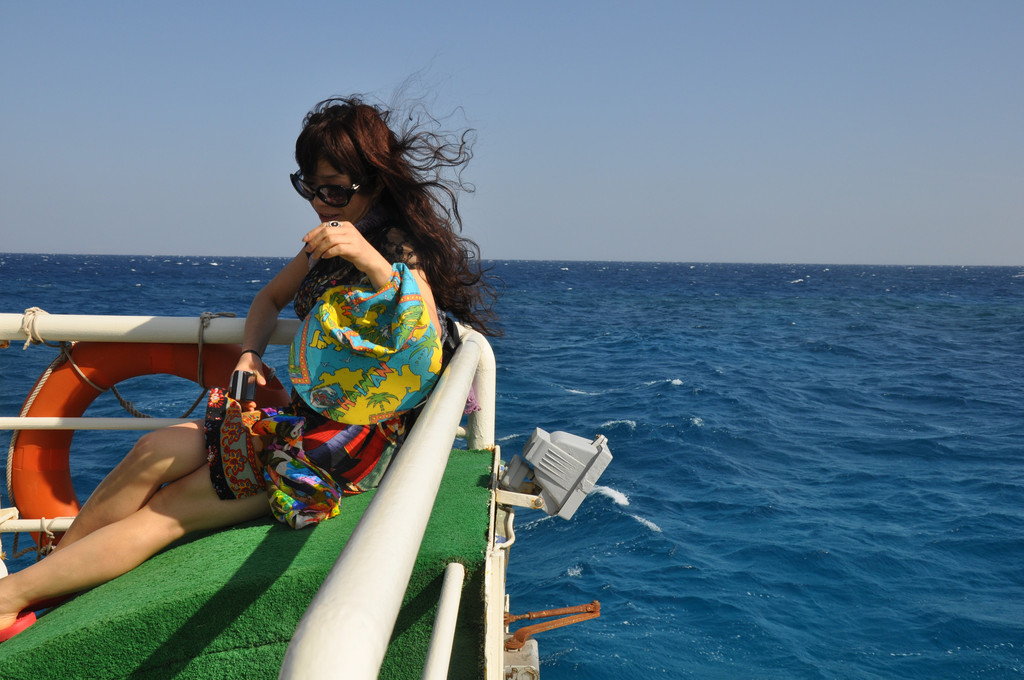 说实话,刚潜入海底时是无畏而冲动的,对身边游过的斑斓鱼群新鲜、惊喜,看摇曳的海草,触摸深海长满苔藓的礁石,总之,好奇海底的一切。可时间一久,对于口里含着氧气咬管用嘴呼吸就很不习惯了,一不小心就会用鼻子呼吸或者喝一大口海水,于是向教练竖着大拇指(请求上浮的动作)浮出水面,来到甲板上休息。此时,手机铃响,是远在国内的老母亲打来电话,说从新闻里看到有旅游团在埃及红海潜游被鲨鱼攻击,让我一定不要下海,要注意安全。接完电话之后,当我再次下海,就已经变成了惊弓之鸟,被鲨鱼攻击的消息挥之不去,海里所有游动的生物,仿佛都是鲨鱼,潜海的兴奋和乐趣荡然无存,只好上艇晒太阳、拍照。