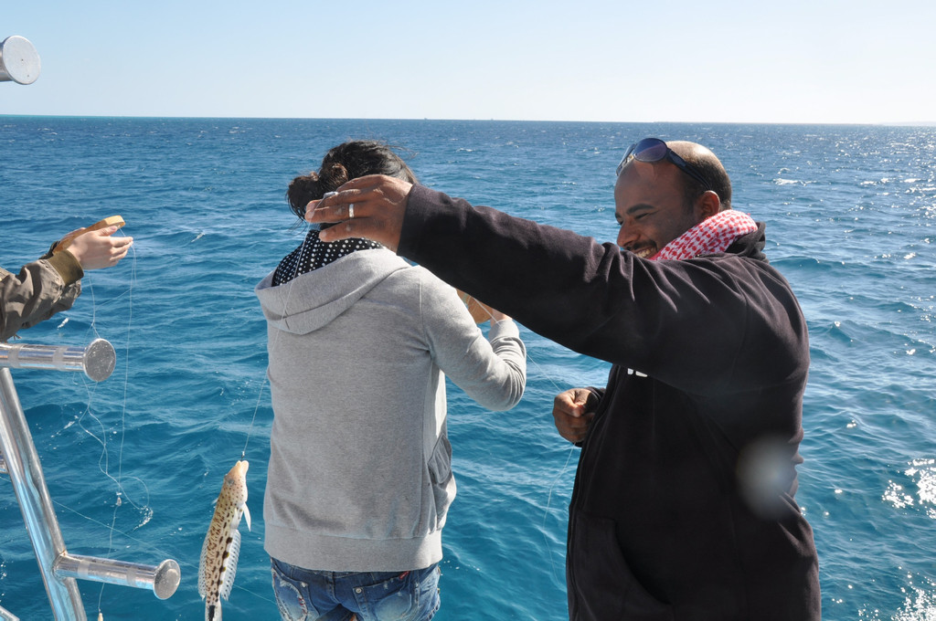 乘座游艇来到红海深处换上泳装,我们每人都配有一位专业教练,向我们详细讲解潜水设备和水下交流手势后,我们跟随教练一起下海潜入海底。