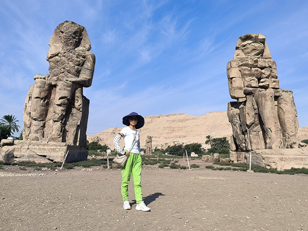 D:门农巨像: 门农巨像是矗立在尼罗河西岸和国王谷之间原野上的两座岩石坐像。这两尊门农巨像,原立于一塔门前,高约18米,基座侧面浮雕上挥着尼罗河神哈比莲花及纸莎草的图案,象征着上下埃及的统一。坐像是由新王国时代鼎盛期的阿蒙荷太普三世建造的,风化严重,面部早已不可辨识。坐像身后,原来是他的葬祭殿,但后来的法老拆了这座建筑,并把他做为自己的建筑物的石料。到了托勒密王朝时代,建筑物已经完全被破坏了。人们认为石像是希腊神话中的门农的雕像,就给石像取名为门农巨像。