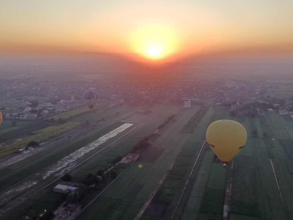飞行中,随着高度的攀升,风在耳边呼呼作响,一种强烈的刺激感涌上心头,这可是在高空啊,脚下是广袤无垠的大地,这种奇妙的体验,一生都难以忘怀。此时,天边泛起了微光,晨曦慢慢破晓,金色的阳光如同被打翻的颜料,肆意地洒向大地。我们数次穿越被阳光映照得闪闪发光的尼罗河,河水在阳光的轻抚下,像是一条流动的金色丝带。村庄里升起袅袅炊烟,早起的人们已经开始了新一天的劳作;绿洲绿意盎然,各种植物在微风中轻轻摇曳,展现出勃勃的生机。每掠过一处风景,都忍不住发出兴奋的呼喊,想要把这美好的瞬间永远铭记,内心也不断感慨大自然的鬼斧神工与生活的奇妙。