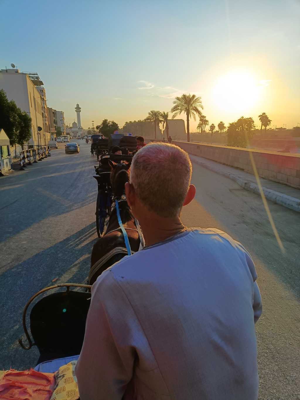 就餐后,阳光正好,我们遂即开启了一场独特的马车之旅。一坐上马车,奇妙的体验就开始了,路上的汽车似乎都在为这古老的出行方式让路,纷纷停靠在一旁。赶车的老大爷精神矍铄,脸上洋溢着质朴的笑容,一边哼着小曲儿,那曲调虽然听不懂,却充满了欢快的节奏,一边得意洋洋地挥动着马鞭,带我们在老城区的大街小巷里四处溜达。卢克索有红绿灯,但马车就像拥有 “豁免权” 一样,一路畅行无阻,这种特别的待遇,让整个旅程都充满了趣味。