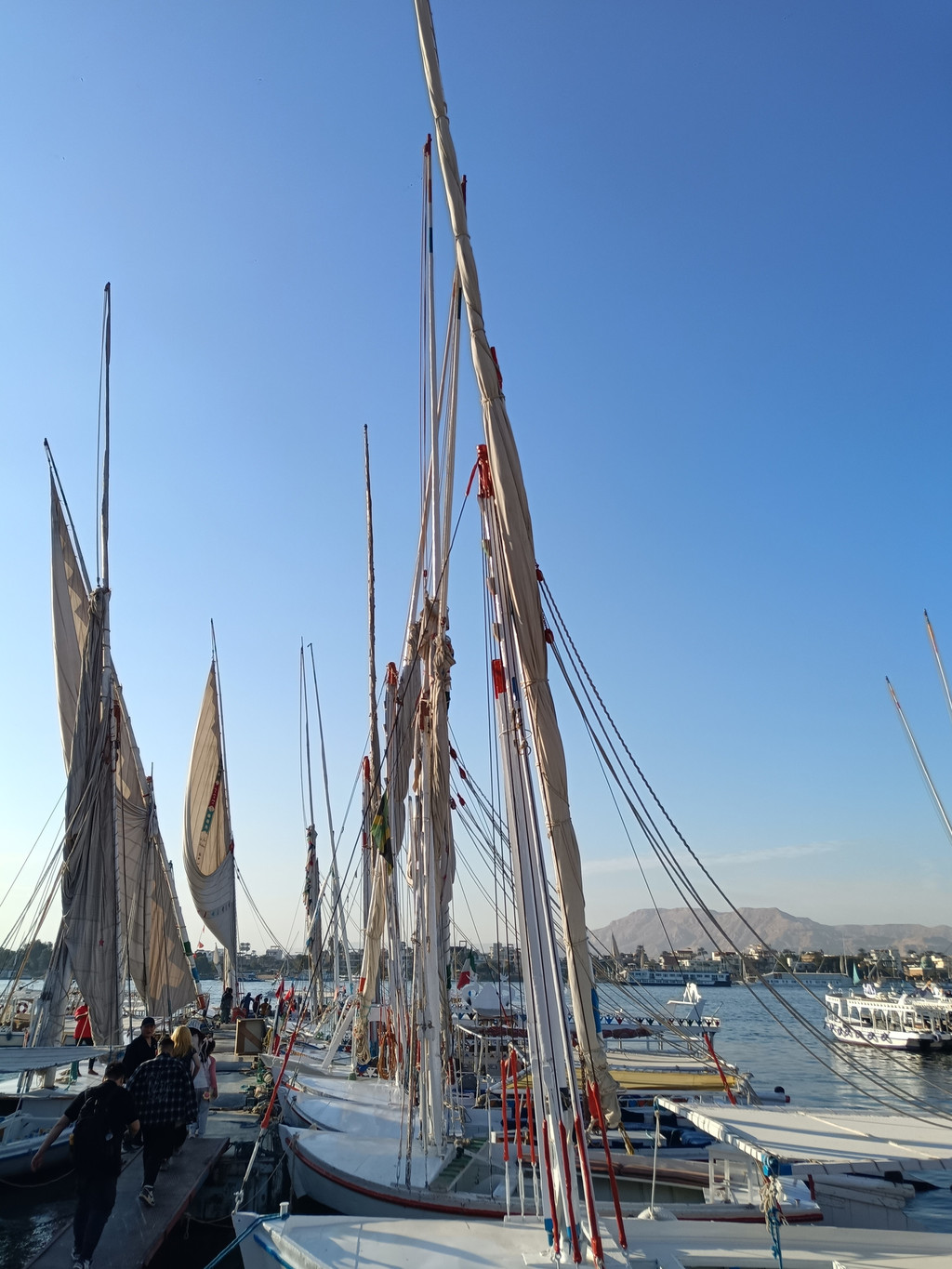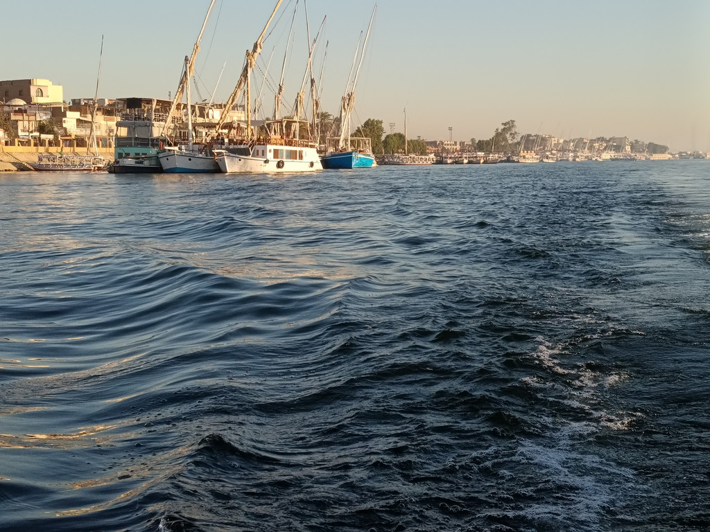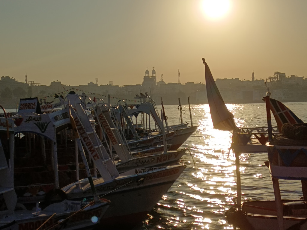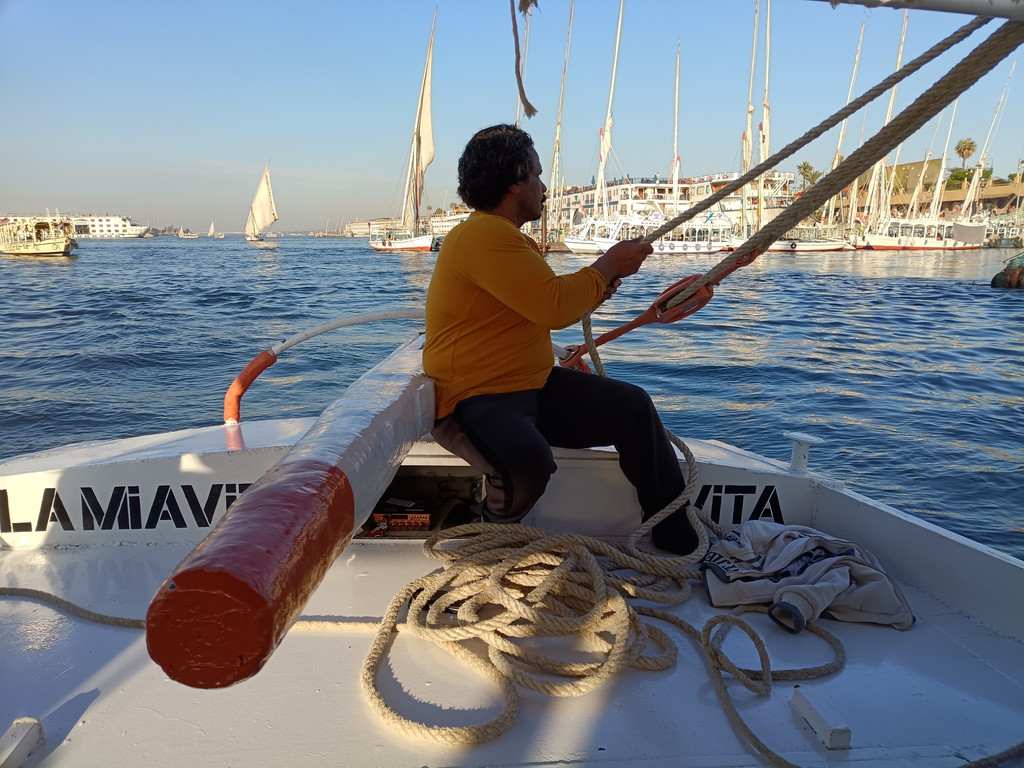 逛完市区,我们来到尼罗河畔,登上帆船开启与尼罗河的深度对话。老船工和儿子们配合默契,摇橹、升帆一气呵成,动作娴熟得让人赞叹。悠扬的阿拉伯音乐响起,帆船缓缓驶向河中央,河面上帆影点点,微风轻柔地拂过脸颊,带来丝丝凉意。