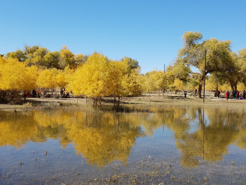 第三站,胡杨林。已是国庆假期的最后一天了,叶子还是没有全部黄,有的是金黄色的,有的是黄绿色,水中倒映着蓝天白云黄树,景区内人不是很多,让人感觉很舒服,边走边看边照像,溪旁、树下,林中,悠哉游哉。