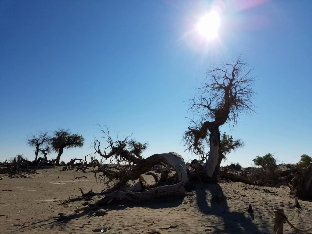 第二站是怪树林。成片死去的胡杨树,胡杨,千年不死,死后千年不倒,倒后千年不腐。一树枯枝弯曲的向上伸着,像临死前挣扎的手臂,抗争着,努力着,却又无可耐何的……荒凉、恐怖,还是去看活着的树吧。