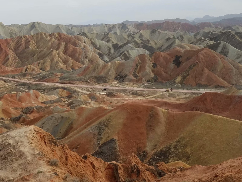 第六天,张掖地质公园,住酒泉。 途中经过本次行程海拔最高点,达板山口3792.75米。从青海省再次进入甘肃省。中途路过一个镇子,听村民说这里是赏油菜花的好 地方,只不过现在过了季节,从村民家买了些蜂蜜、奶皮子,直奔丹霞地质公园。已是下午,人不多,坐景区内游览车进入,看到五彩 斑斓的、高高矮矮的,不知是土还是石头的山,美轮美奂,让人震撼。人间不敢有的景色,大自然赏赐给了我们。奈何照相技术不佳, 手机照出来的这些图片,根本无法展示出它的美,后来听朋友说,要在早晨太阳刚刚升起的时候,才是它最美的时候,那时候,色彩更 斑斓、绚丽。只把自己当画中人,沉醉于此。《三枪拍案惊奇》就是拍摄于此。