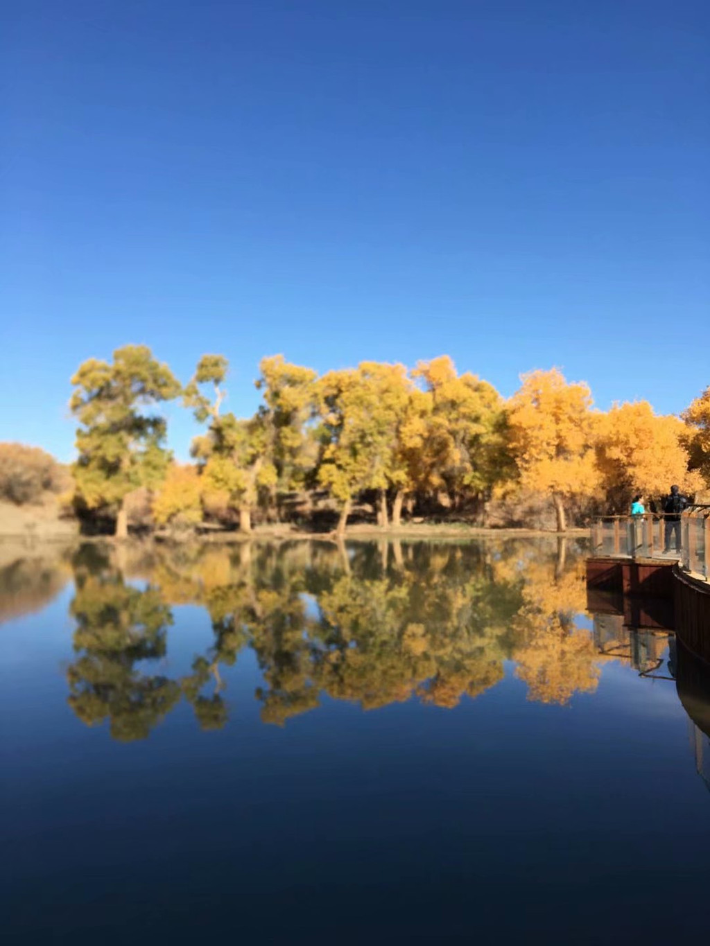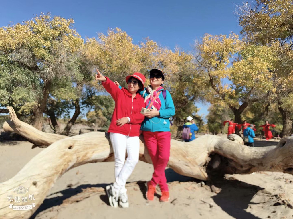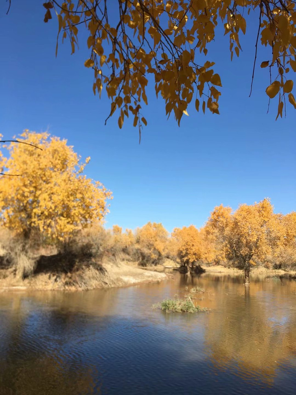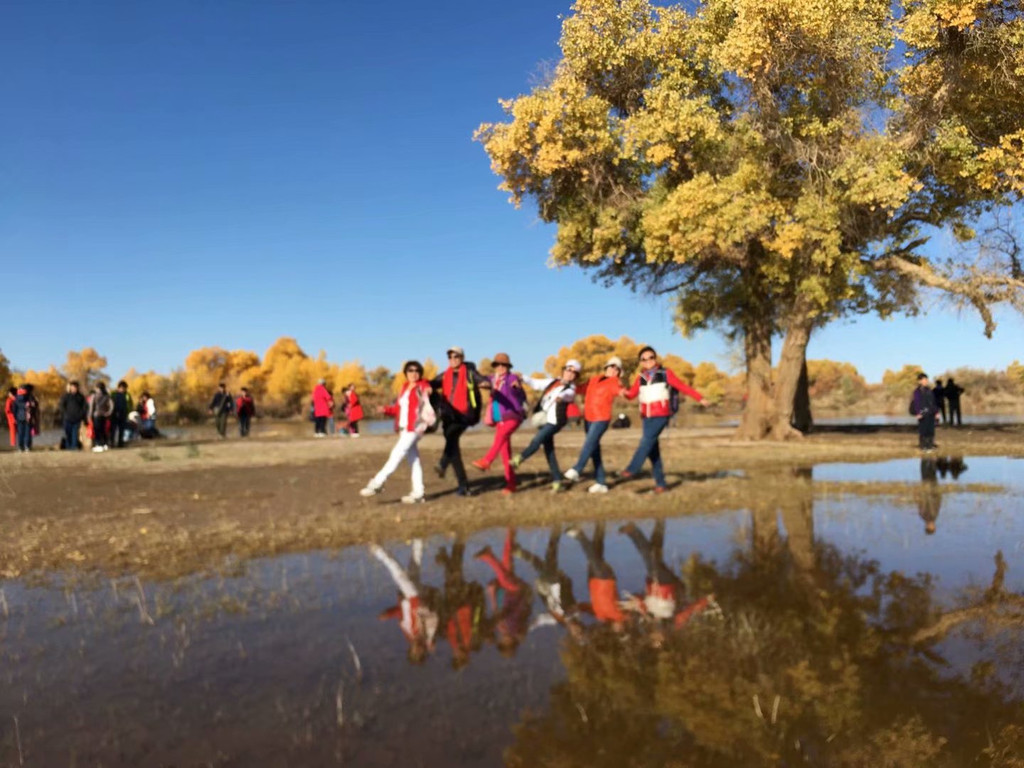 居住地靠近景区。导游说景点主要是一、四、七道桥,八道桥就是沙漠,以娱乐项目为主。中间有车接送。额济纳胡杨林在景区的开始部分十分精彩,因为有水。蓝蓝的天空没有一丝云彩,金黄色的胡杨树,倒映在清澈水里,游人多穿红衣、戴红帽、红围巾,纯色的红、黄、蓝搭配在一起十分的耀眼、好看!人们千辛万苦的来到这里,使劲地、拼命的拍照,怎么也拍不够!我带了自拍架,自觉的充当大家的摄影师,认真的选景、构图、纠正姿势、导演表情。。。。。一天下来,发现上百张照片都是模糊的,只能是有意境罢了!我的手机聚焦功能坏了。我和朋友们不得不接受这个无奈的现实。