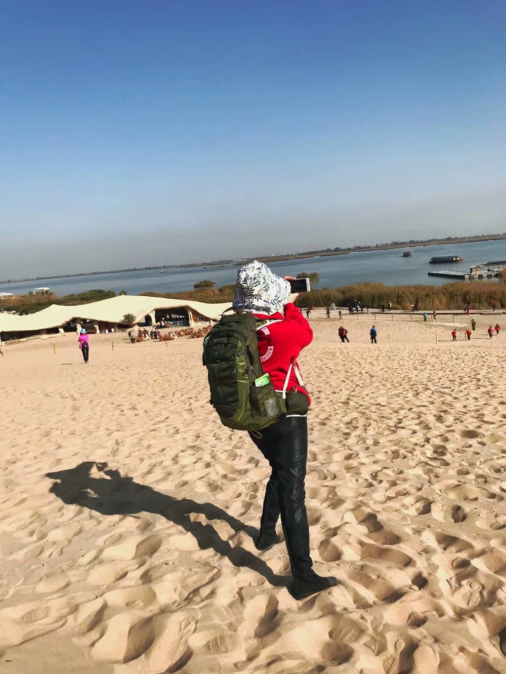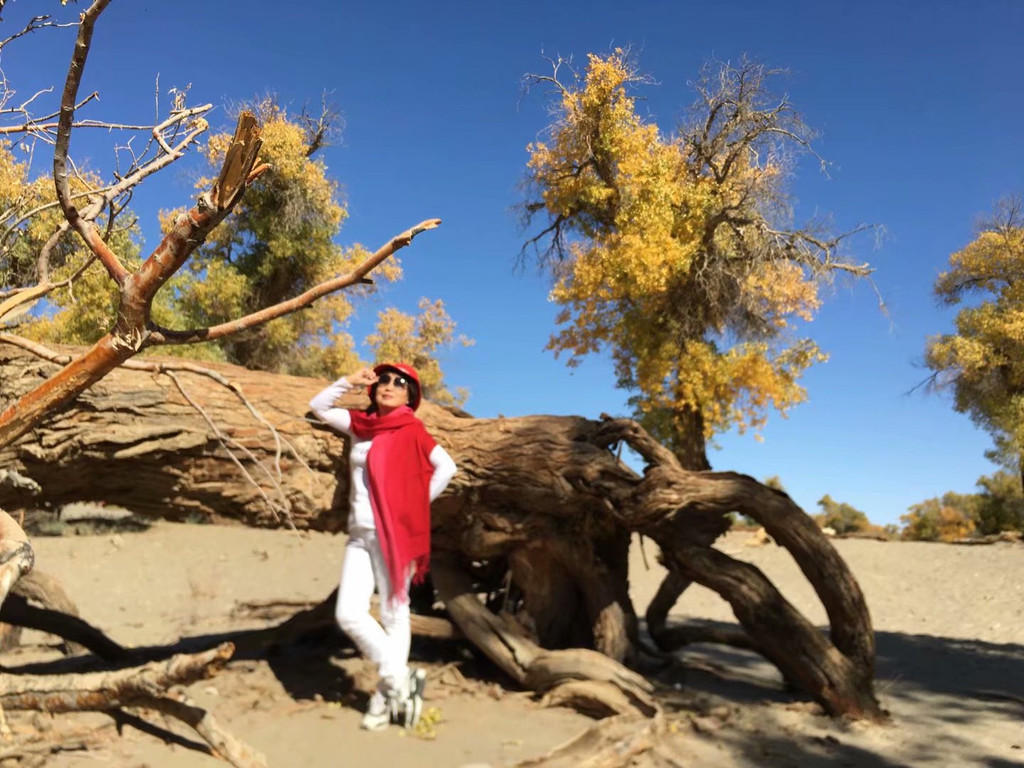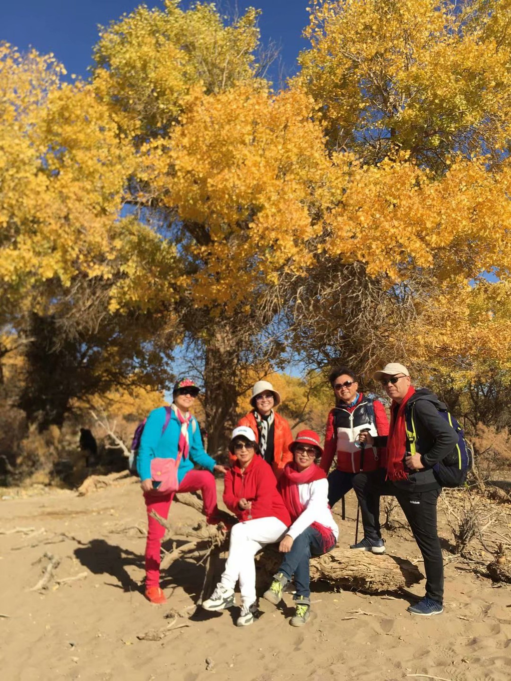 居住地靠近景区。导游说景点主要是一、四、七道桥,八道桥就是沙漠,以娱乐项目为主。中间有车接送。额济纳胡杨林在景区的开始部分十分精彩,因为有水。蓝蓝的天空没有一丝云彩,金黄色的胡杨树,倒映在清澈水里,游人多穿红衣、戴红帽、红围巾,纯色的红、黄、蓝搭配在一起十分的耀眼、好看!人们千辛万苦的来到这里,使劲地、拼命的拍照,怎么也拍不够!我带了自拍架,自觉的充当大家的摄影师,认真的选景、构图、纠正姿势、导演表情。。。。。一天下来,发现上百张照片都是模糊的,只能是有意境罢了!我的手机聚焦功能坏了。我和朋友们不得不接受这个无奈的现实。