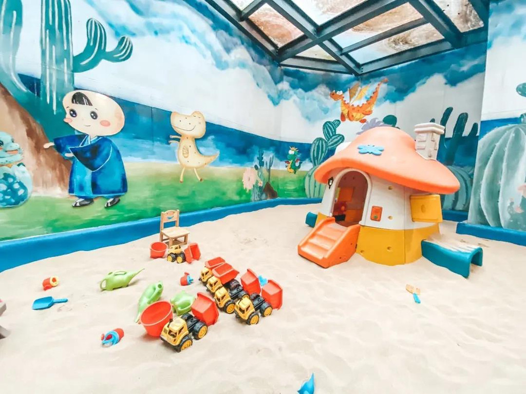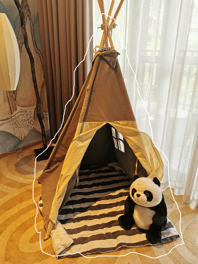 靠近阳台的地方搭着小帐篷,里面住着一只可爱的小玩偶,不出10秒,小朋友的童心就要被俘走了~房间的阳台很大,小木马和熊猫坐在一起欣赏风景。4月的风吹在脸上,很惬意。