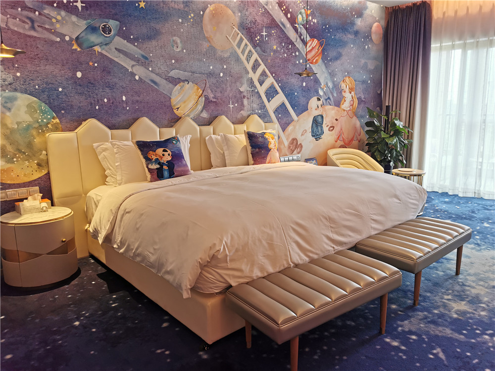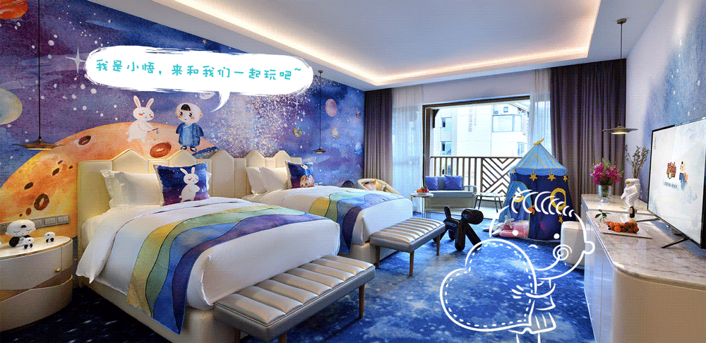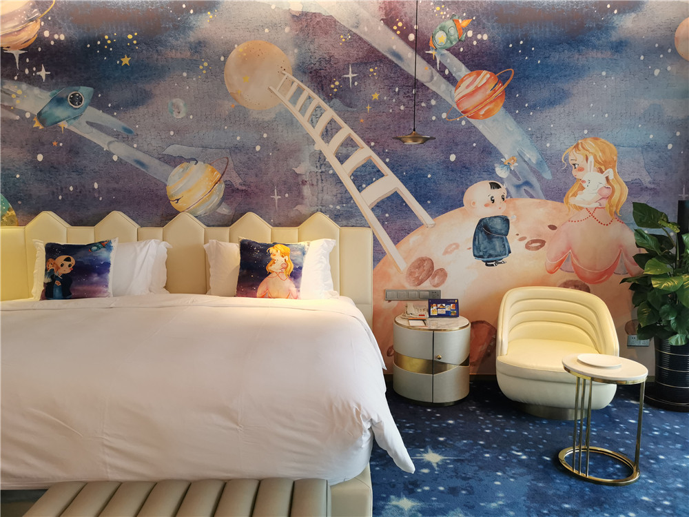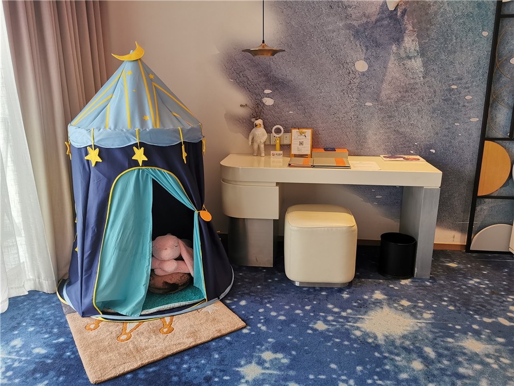 我们本来想住海洋房,前台小姐姐说海洋房在1楼。想着高楼层的视野应该要好些,于是我们住进了5楼的星空房。一出电梯,一同上楼的小朋友就“哇”了出来,拉着妈妈要去飞船那里一探究竟。