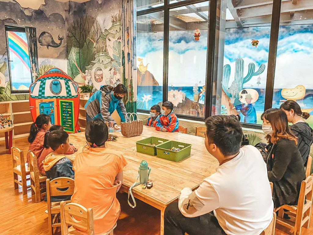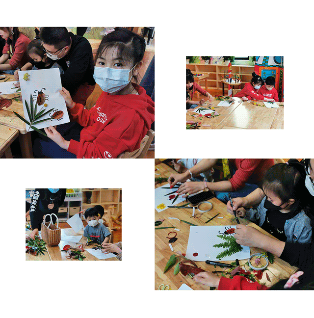 入住那天正好遇到一场亲子活动,十几位小朋友围在一起做手工,把亲手采集的树叶和鲜花变成一幅画。看到他们做的七星瓢虫,老阿姨自愧不如。也许是被快乐吸引,中途有更多小朋友申请加入进来呢。