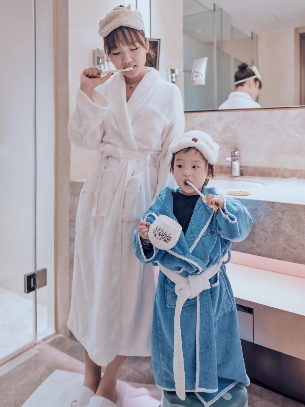 儿童拖鞋和儿童浴袍当然少不了啦!蓝色的小浴袍可爱极了,穿它去游泳泡温泉,就是园区里最靓的仔。不爱洗澡的小朋友也要抢着多洗几次穿穿浴袍啦~