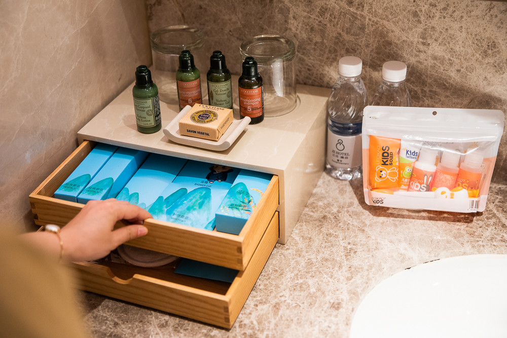 为了防止小朋友因为玩闹而被桌椅碰上,亲子套房里的所有桌椅衣柜都被设计为圆弧形。