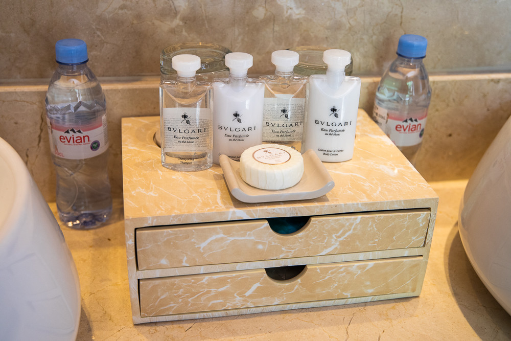 温泉别墅用的洗护用品是宝格丽,矿泉水用的是依云。