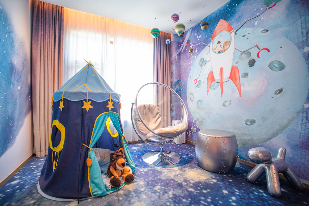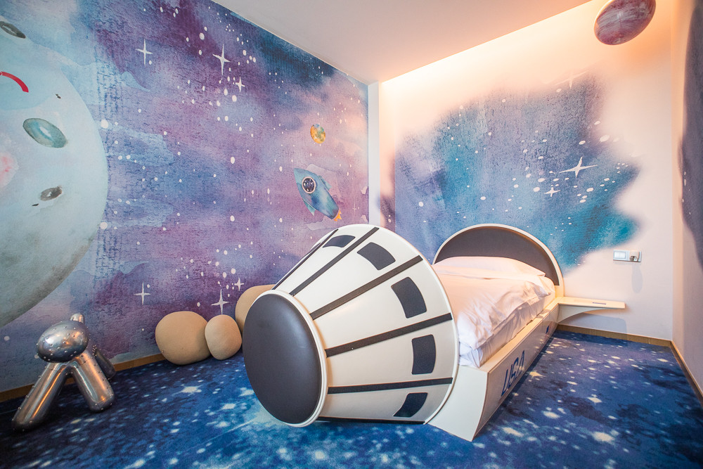 床是小火箭、旋转太空舱椅子可以看天花板上的星星。