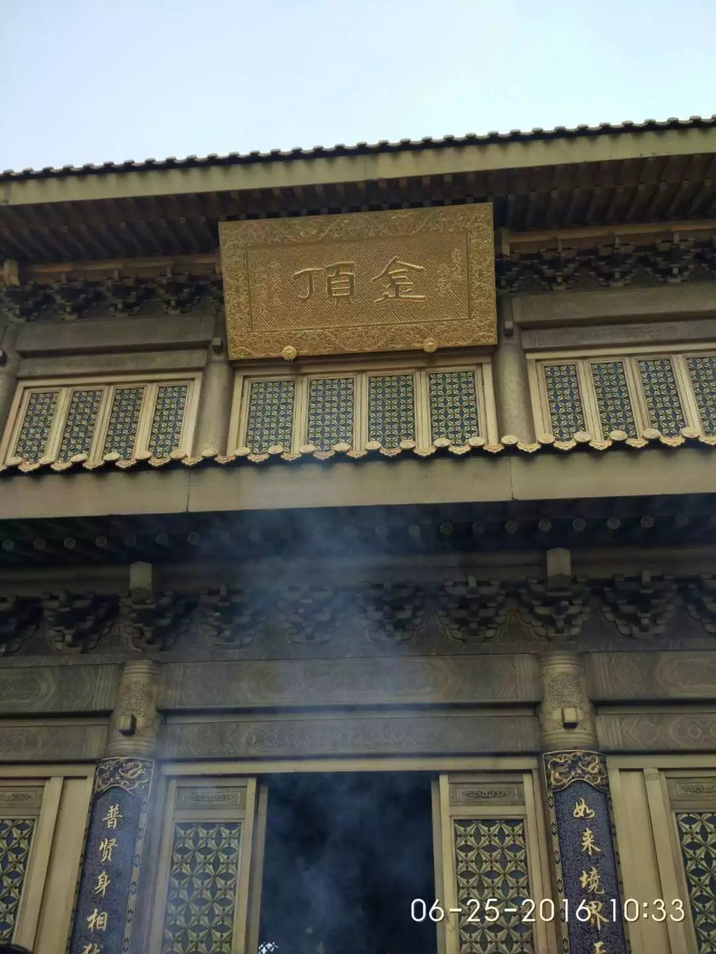 十方普贤的正面像正对着华藏寺的大雄宝殿——铜殿。为什么称大雄宝殿为铜殿呢?原来大雄宝殿用的是铜瓦,而且梁栓门窗斗拱等也均是铜铸,整个建筑外观呈质朴浑厚的古铜色。铜殿的后面就是华藏寺的金顶——金殿,因为它用的是金瓦,整个建筑外观呈灿烂夺目的金色,故得此名。金顶是峨眉山最高的殿堂,也是我国目前最大金殿。导游介绍,写有“金顶”两字的匾额是纯金打造的,由某位发家致富、前来还愿的居士捐赠。在金殿,阿李还近距离观看了寺僧将信众捐赠的金箔一张张地贴在佛像脸上,第一次真正明白了何谓“往脸上贴金”。