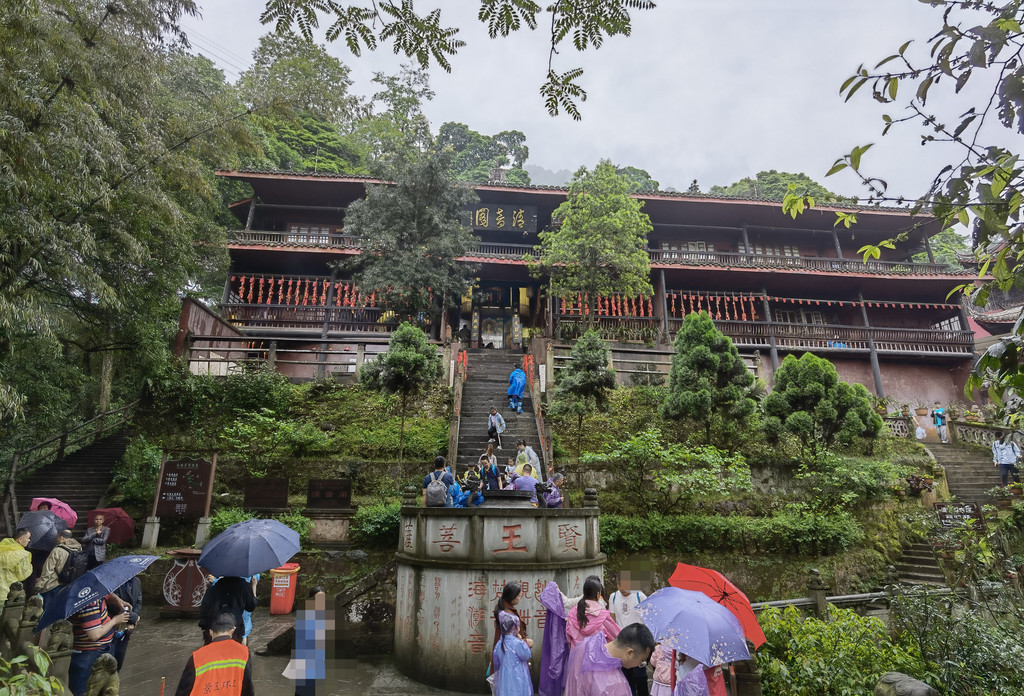 金顶赏了云海,拜了十方普贤、卧云禅寺、华藏寺,就坐索道下山了,再看看索道旁边的接引殿后,返回雷洞坪。酒店休整后,退房存行李。开始步行往返洗象池,最后乘车从雷洞坪到五显岗。