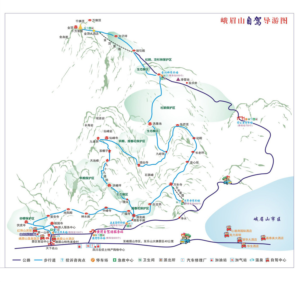 景区巴士主要站点:峨眉山黄湾车站→峨眉山雷洞坪车站→峨眉山零公里车站→峨眉山万年寺车站/峨眉山五显岗车站→峨眉山报国寺车站/峨眉山黄湾车站。(官方说单程行驶预计1.5小时左右,个人感觉差不多2个小时。)