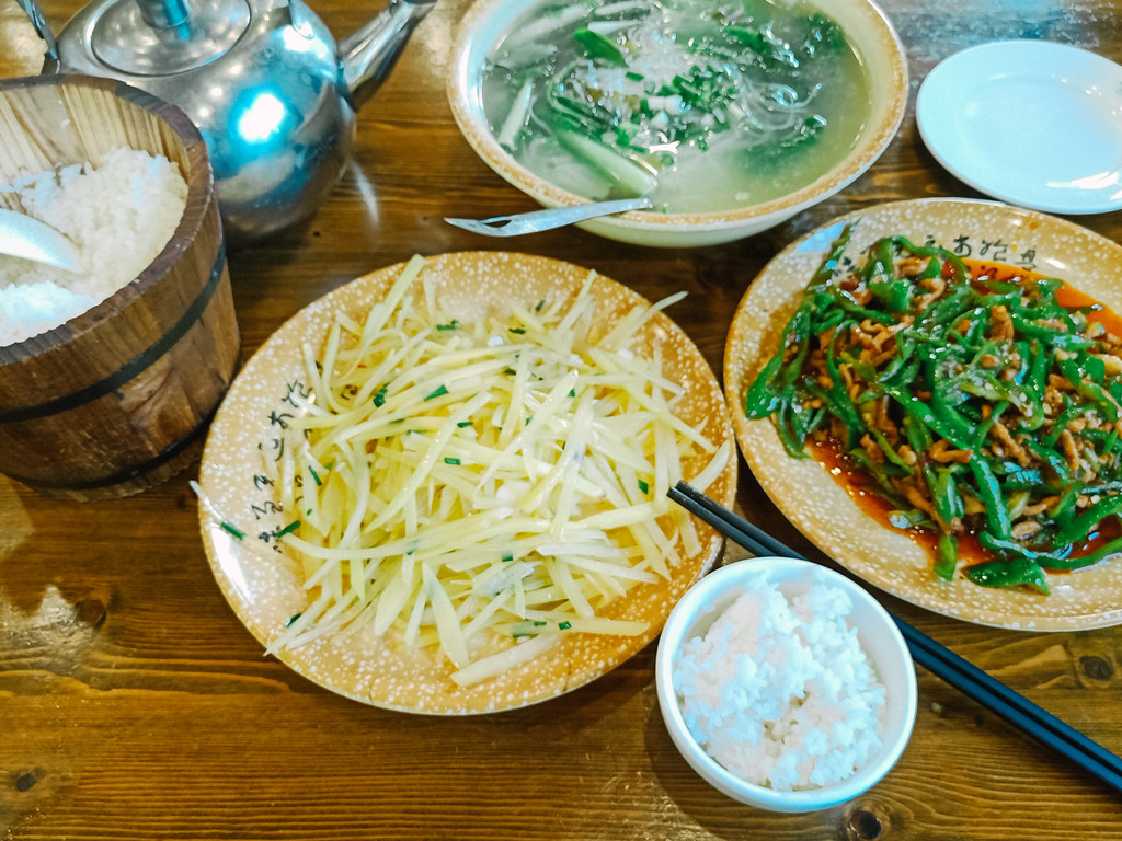 景区外:游客中心周边酒店、客栈的价格在60-400元之间,旁边有美食街,价格适中。