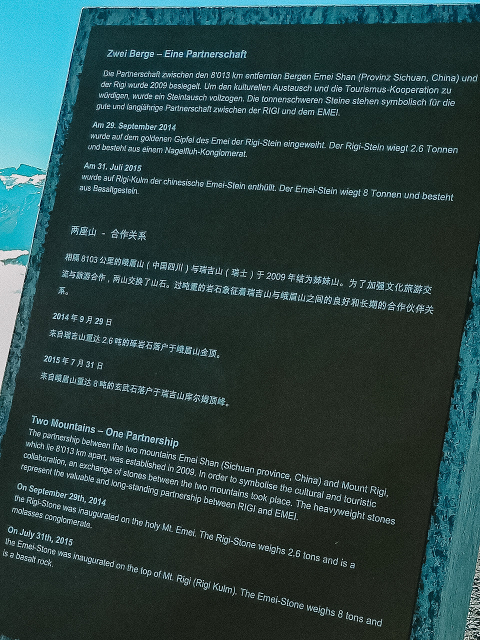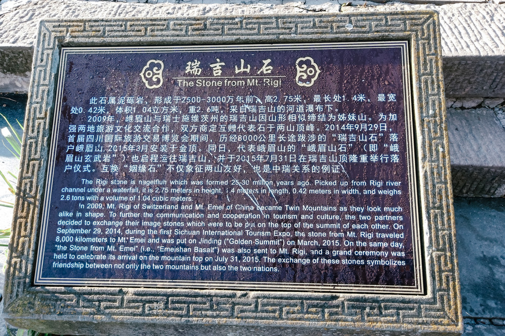 1. 关于瑞吉山山石,峨眉山与瑞士的瑞吉山于2009年结为姊妹山,为加强两地旅游文化交流合作,两山交换了山石。2018年,小编在瑞吉山山顶看到了峨眉山山石,时隔三年,又在峨眉山金顶看到了瑞吉山山石。