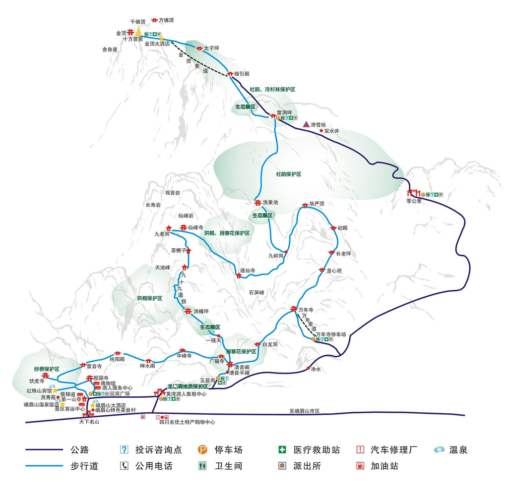 路线一:游客中心 800m 报国寺 1km 伏虎寺 1.5km 雷音寺 2.5km 纯阳殿 3.5km 神水阁 1km 中峰寺 2.5 清音阁 1km 一线天 0.5km 生态猴区 4.5km 洪椿坪 10km 茶棚子 5km 仙峰寺(九老洞) 6km 遇仙寺 3km 九岭岗 2.5km 洗象池 4km 白云寺 3.5 km 雷洞坪 1.5km 接引殿 6km 金顶(全程约60.3km)
