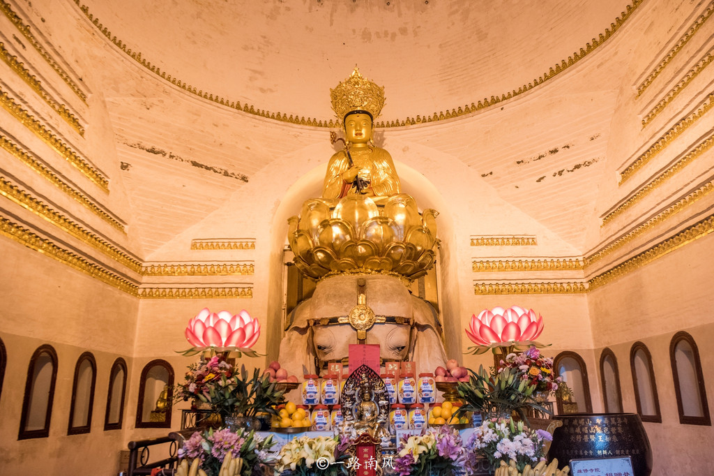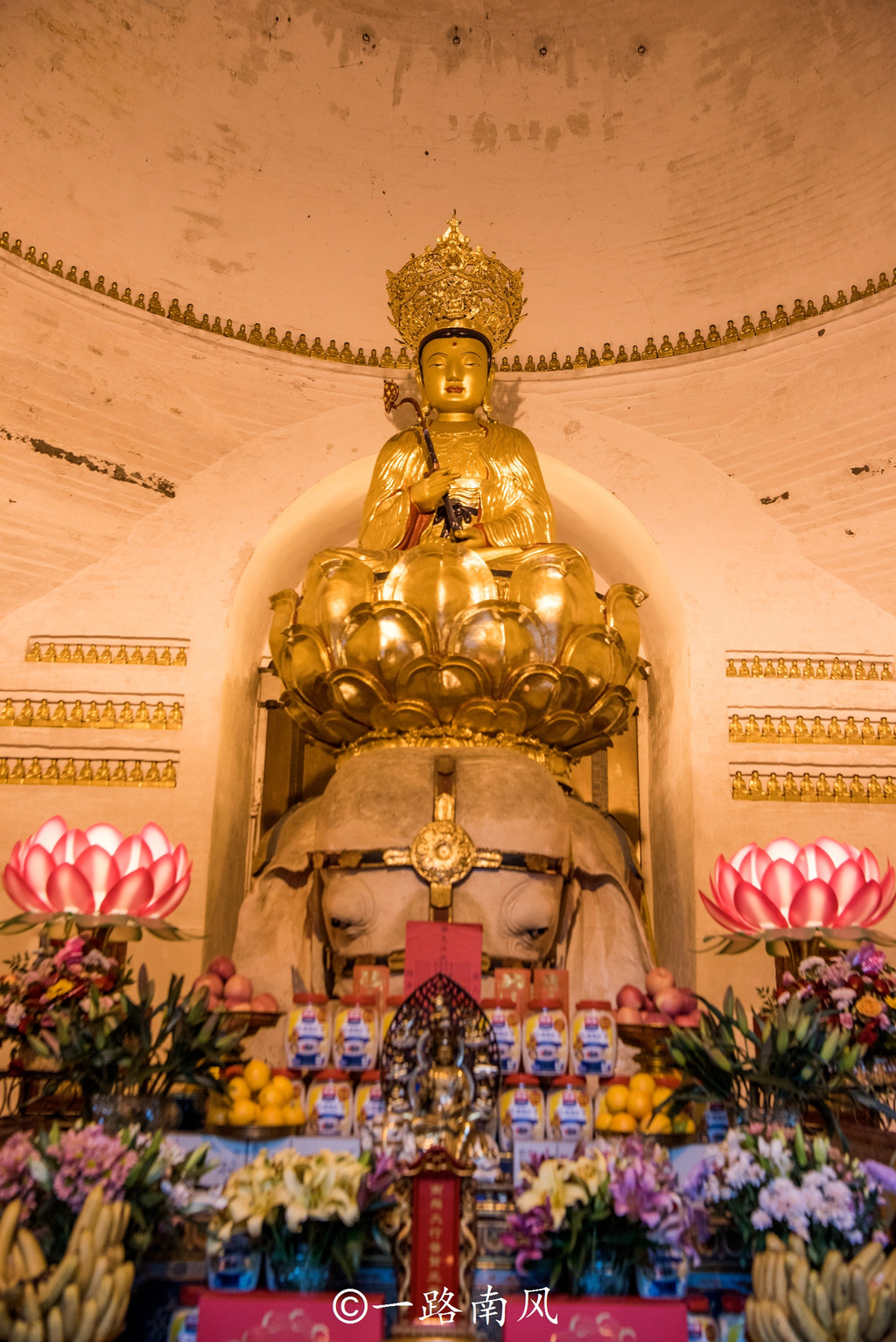 万年寺的无梁砖殿造型独特,和汉传佛教的殿宇完全不一样,远远看去有点像蒙古包,殿内的普贤铜像是中国现存最大的古代铜佛像,也是现存最大的古代金属铸件之一,莲台以上为黄铜,白象为青铜,整座佛像和坐骑分多个地方铸就,大部分在峨眉山本地制作,也有一部分在成都制作。