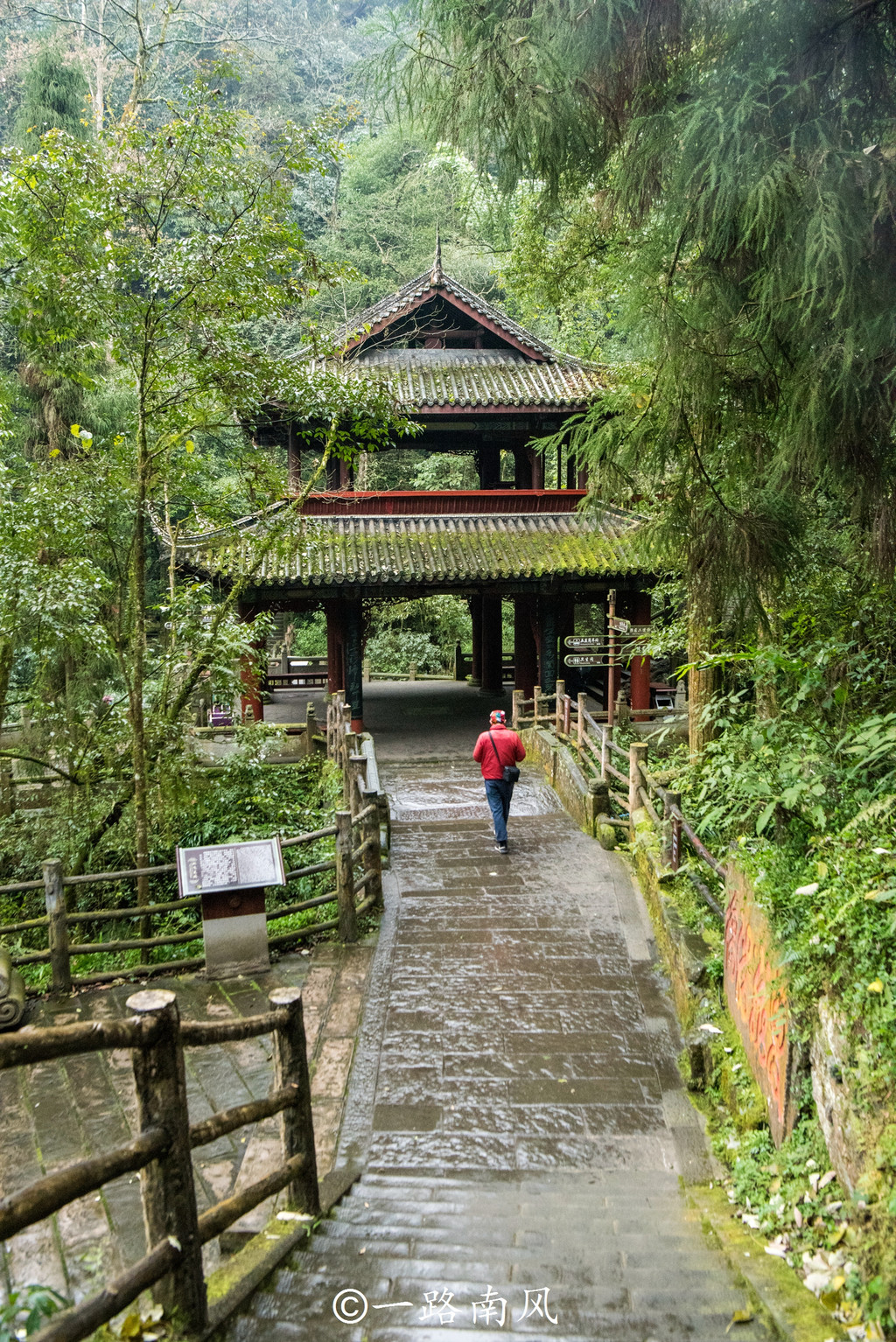 雨忽下忽停,小径、拱桥逐渐湿漉,草木在雨水的滋养下越发显得青翠,如果不是亲眼所见,很难想象冬季的峨眉山半山竟然还如此绿意盎然。