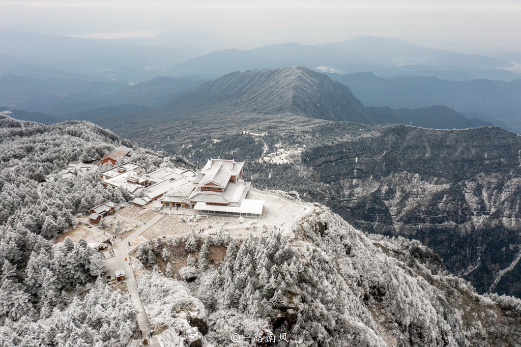 用无人机升空航拍,但见华藏寺的各座建筑物和周边的草木尽数披上“白纱”,悬空600多米的断崖也是灰白一片,崖边还有一大片白色云雾随风缥缈。