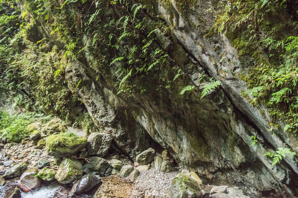 继续往前,道路并不难走,但两旁的山体、断崖非常陡峭,就像一面面巨大的屏障耸立在眼前,有的石壁寸草不生,有的石壁长满了青苔,或者蕨类植物。