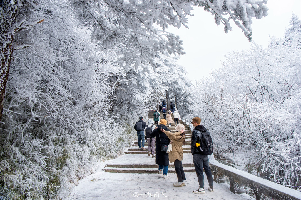 雾气时聚时散,阳光和游客玩起捉迷藏的游戏,踏雪前行,仿佛走上天梯,前往仙境,蓦然间分不清自己是在风景之外,还是画作之中。
