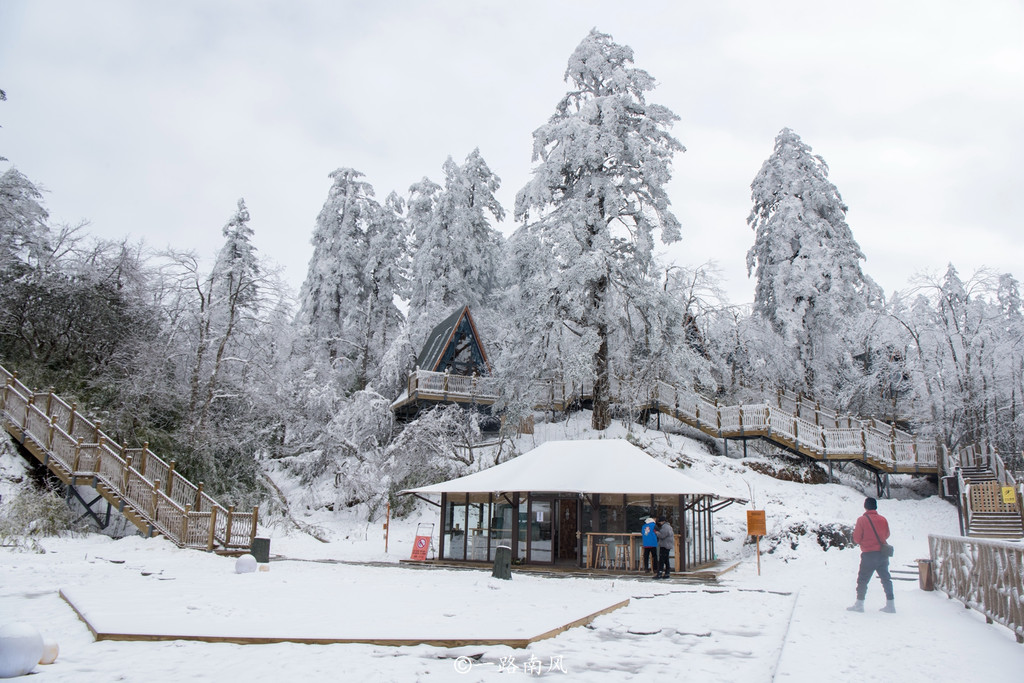 为了欣赏日落和日出,我们提前一天来到雷洞坪,虽然因为天气的原因看不到日落,却巧遇一场大雪,第二天清早徒步1.5公里乘坐缆车前往金顶,但见沿途白茫茫一片,奇特的雾凇奇观让我们对金顶之旅充满期待。