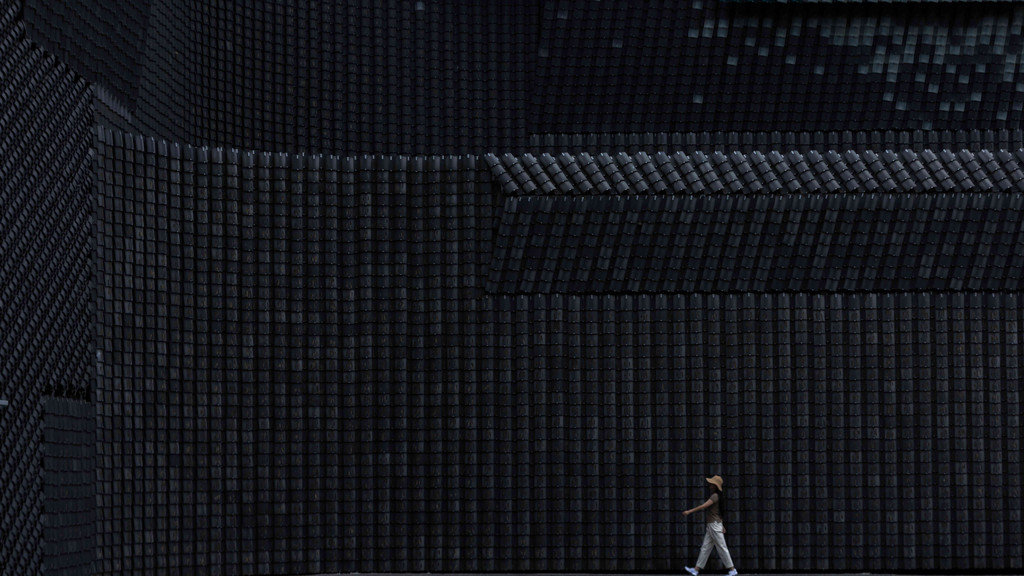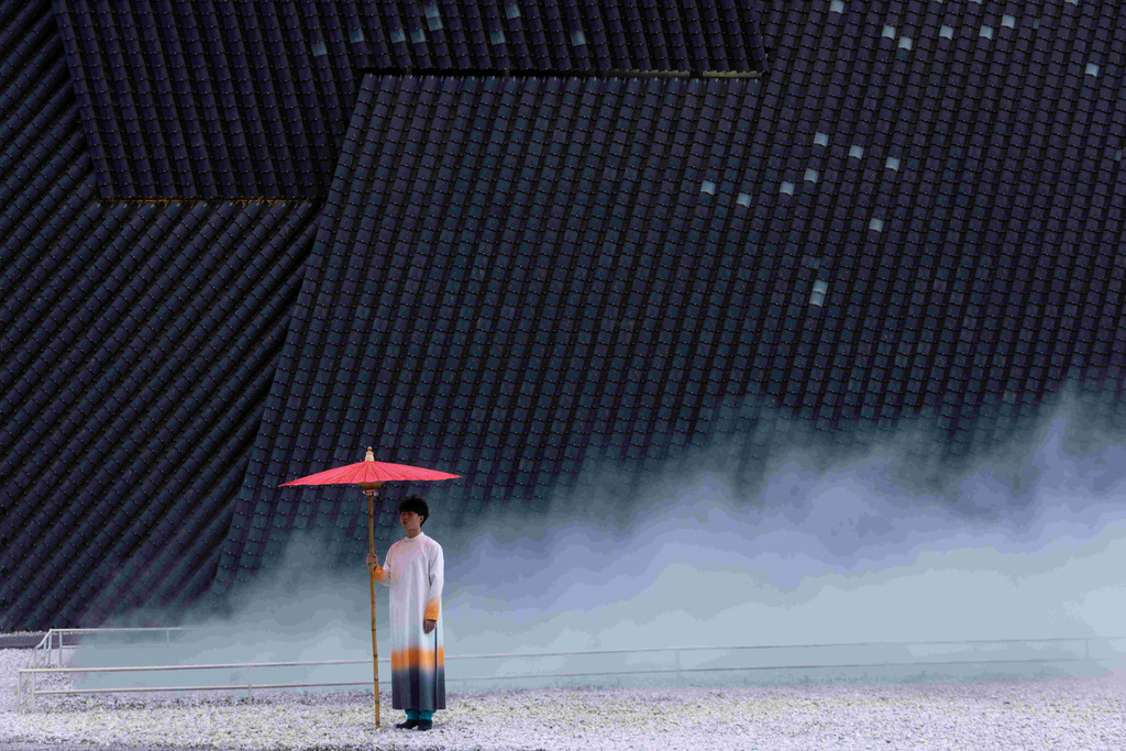 以“瓦”和“屋顶”为母体元素50万片玻璃瓦片构成“屋面”,从地表到墙身、从下到上逐渐蔓延覆盖,创造出从人间到天界的意象及视觉过渡,如同从天界俯瞰世间万物,亦真亦假,亦“云之上”,亦“人世间”。