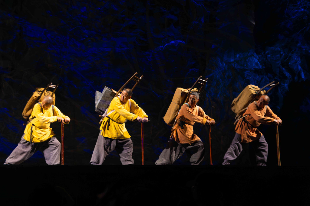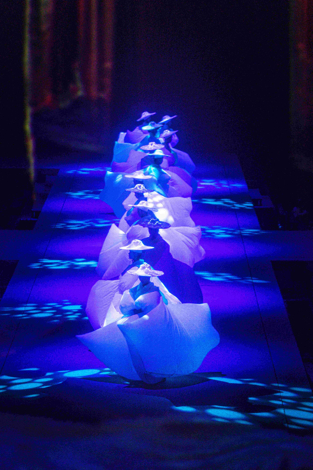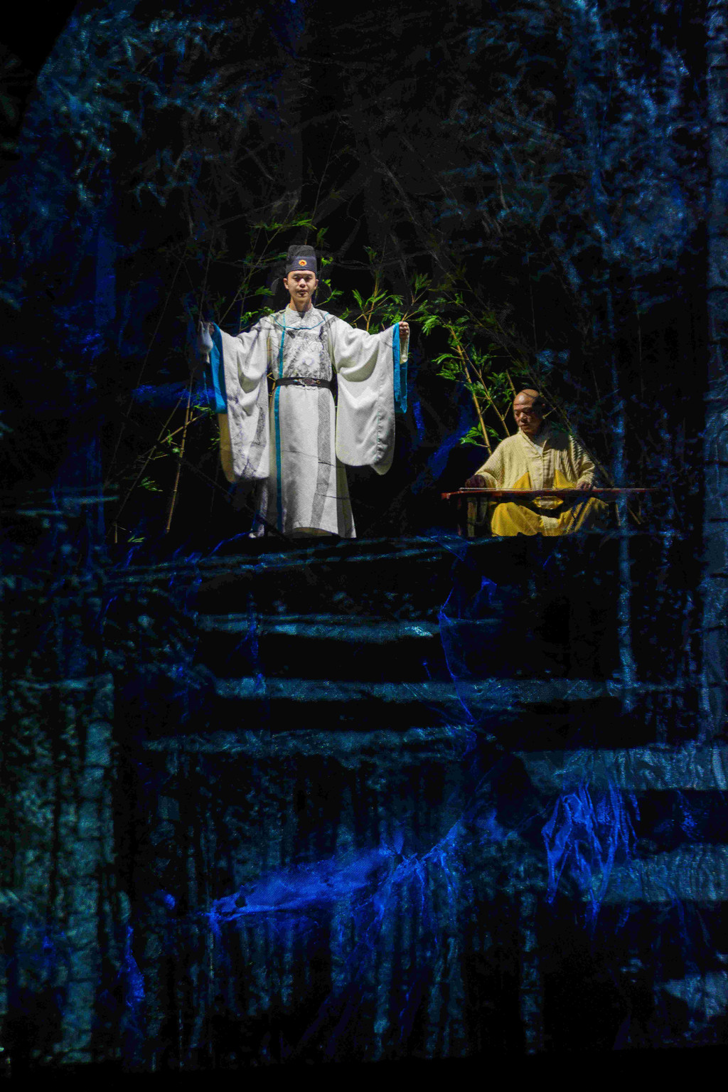 背夫空间里投影出竹林山泉,李白在峨眉山留下白衣翩翩,在万年寺,他与广浚和尚听琴,李白席地而坐写下高山流水之音:“蜀僧抱绿绮,西下峨眉峰。为我一挥手,如听万壑松。客心洗流水,余响入霜钟。不觉碧山暮,秋云暗几重。”在铝网手工织就舞台山石屏障里,僧人和李白留下千古剪影,琴音从唐朝传来,伴随晨钟暮鼓,云蒸霞蔚,舞台下是行走而来的游客,灯光渐隐,仿若秋云暗叠之下,飘过万壑松风。