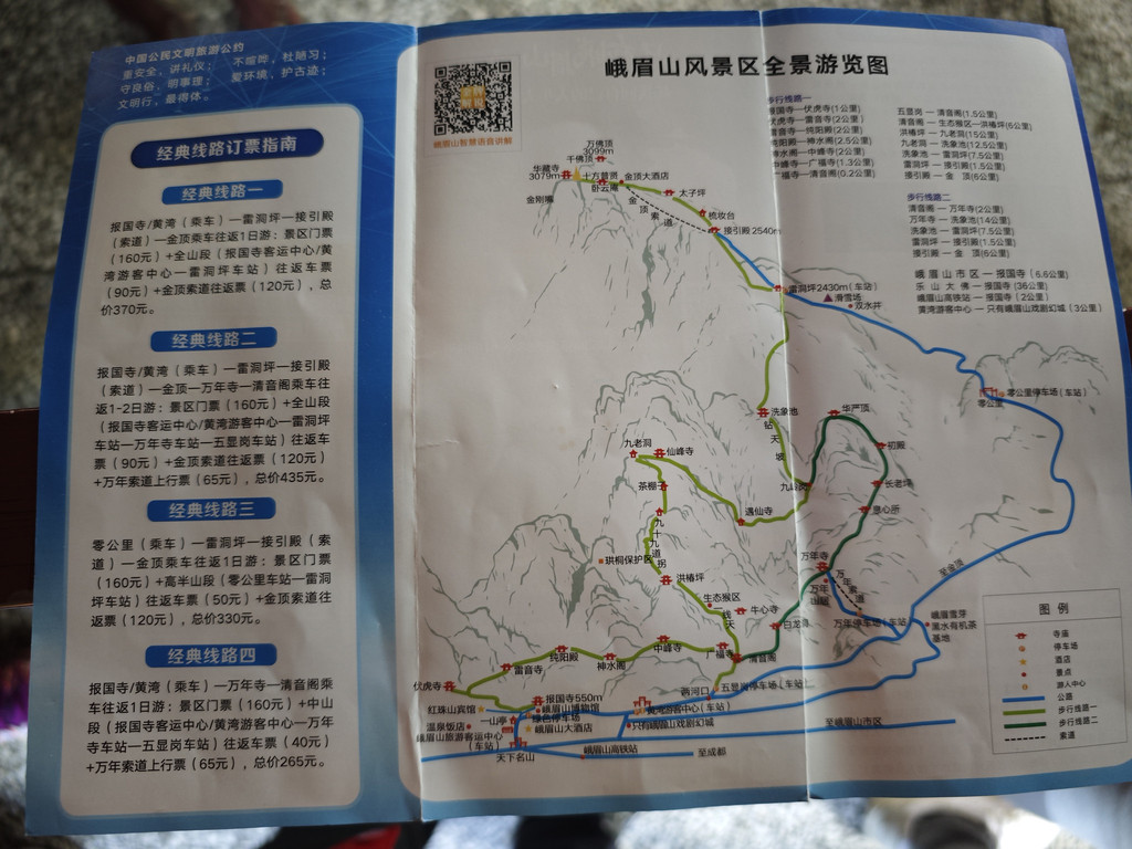 金顶路线:先到万年停车场---坐景区车---到雷洞坪停车场(海拔2430米)---接引殿---梳妆台---太子坪---金顶大酒店---千佛顶(海拔3099米)---华藏寺---金刚嘴---原路返回。