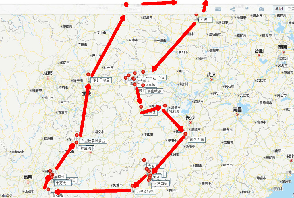 此外,为了串起行程,就把“五岳“中唯一没登过的衡山捎上,这也是另一种“补缺“。之后,再把“甲天下“的桂林山水(漓江、阳朔和龙脊梯田)领略一番,顺路去柳州“胃问“一下“螺蛳粉“,就形成了上面这个出游计划图。