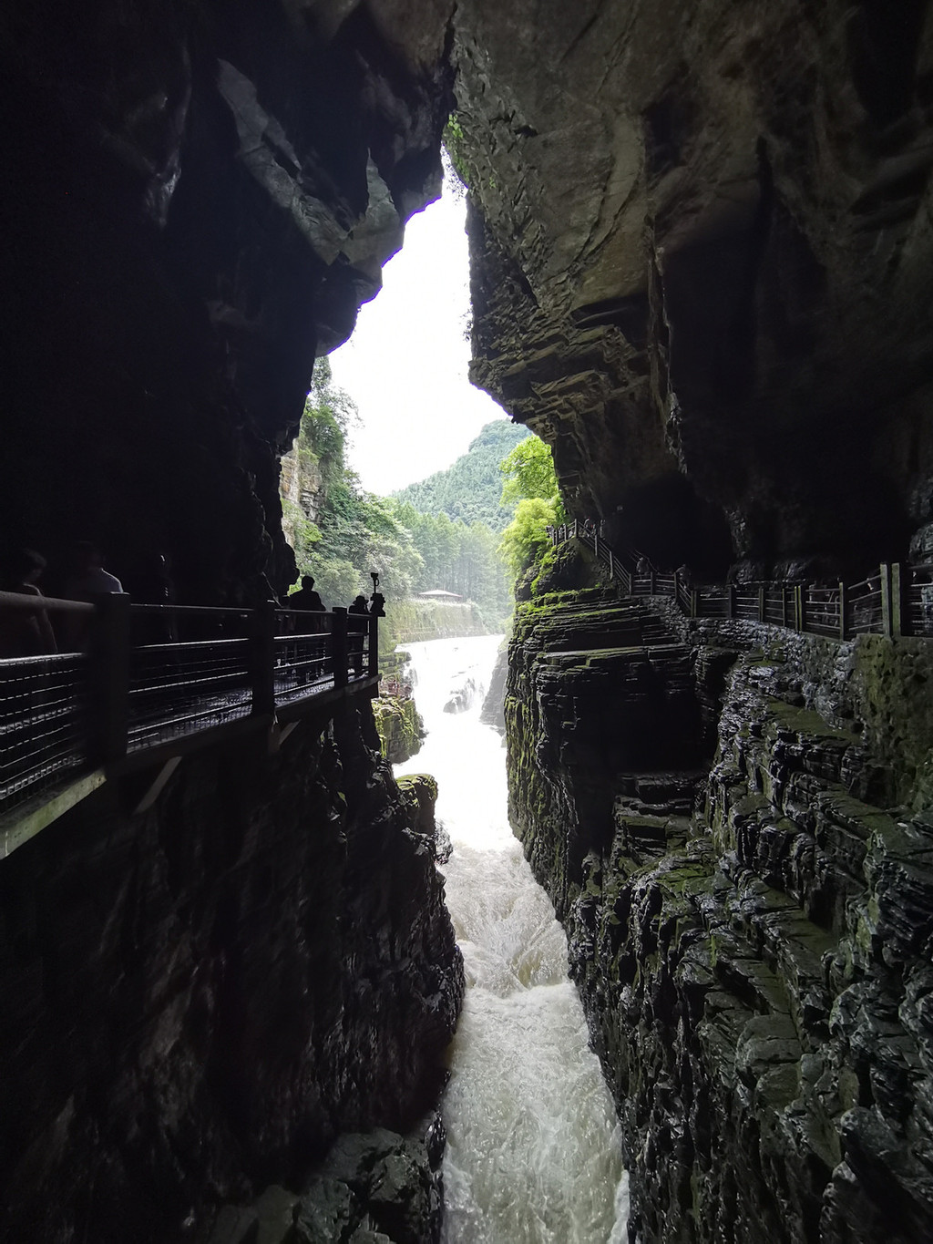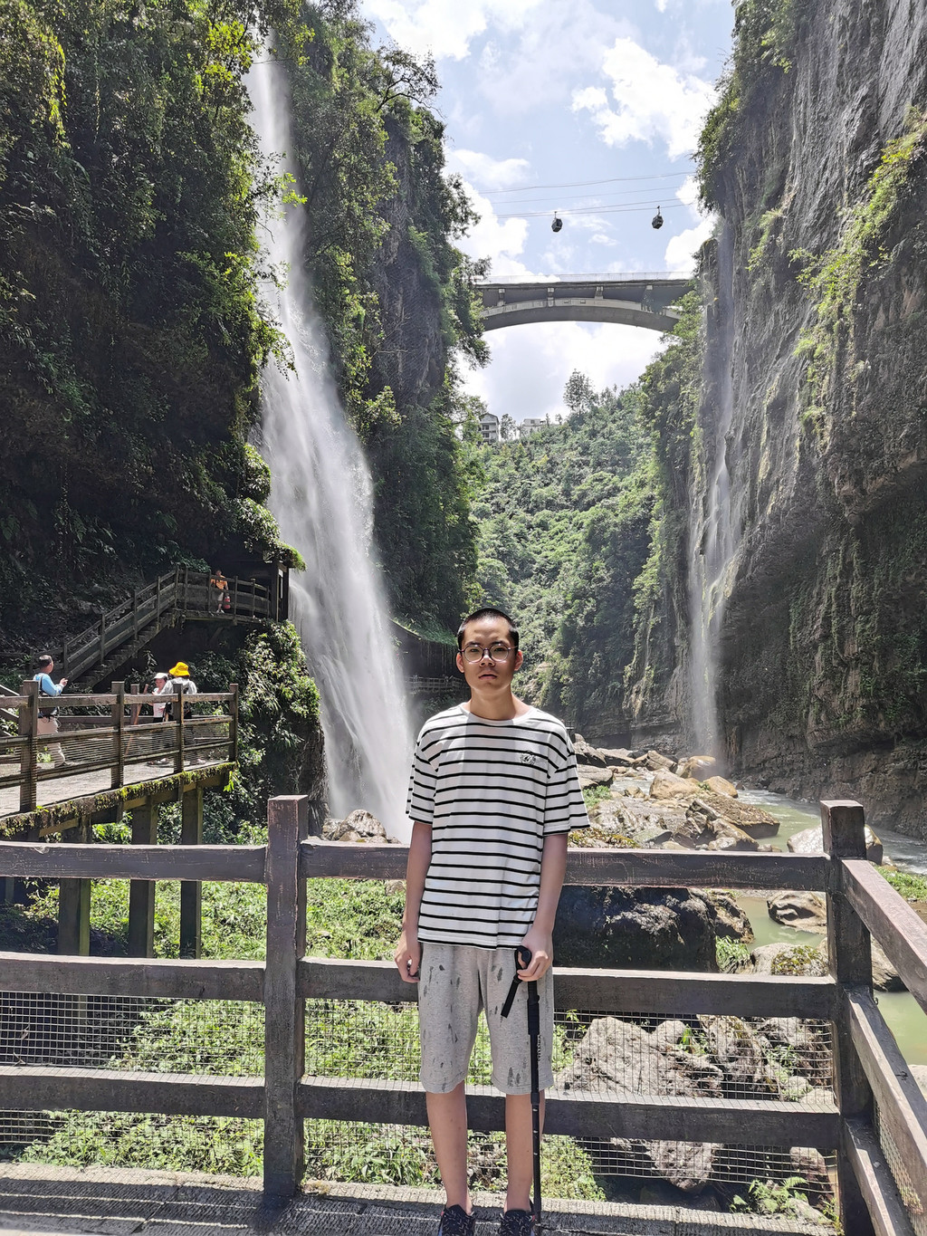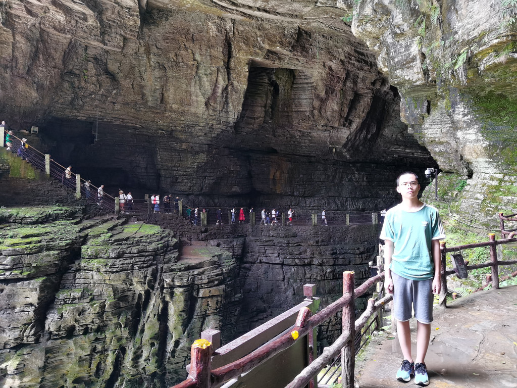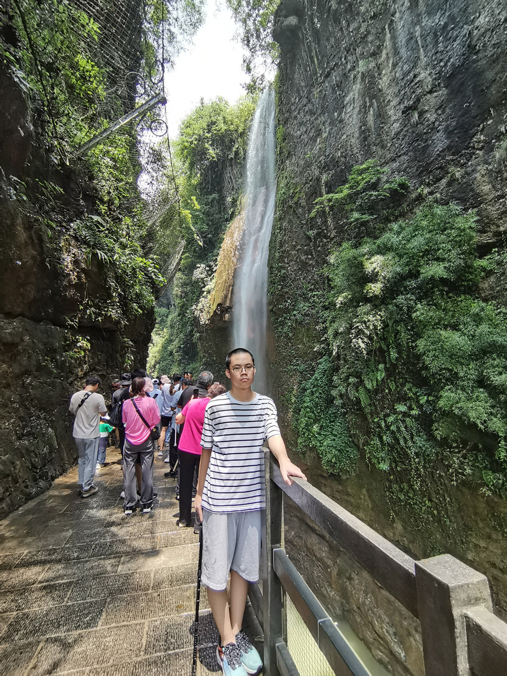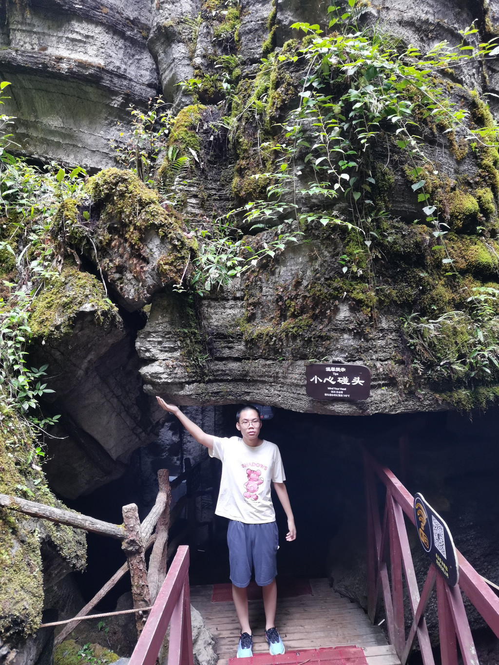 听说地缝走到尽头坐电梯上山顶后,还要在山顶烈日下走二公里才能到达出口,我们走到第三个瀑布后,便原路返回,逆行由入口出。再从索道排队处对面小门出景区,走两三分钟便回到客栈。这样是最最轻松的玩法。我们8点入游客中心,2点出来吃完午饭了。