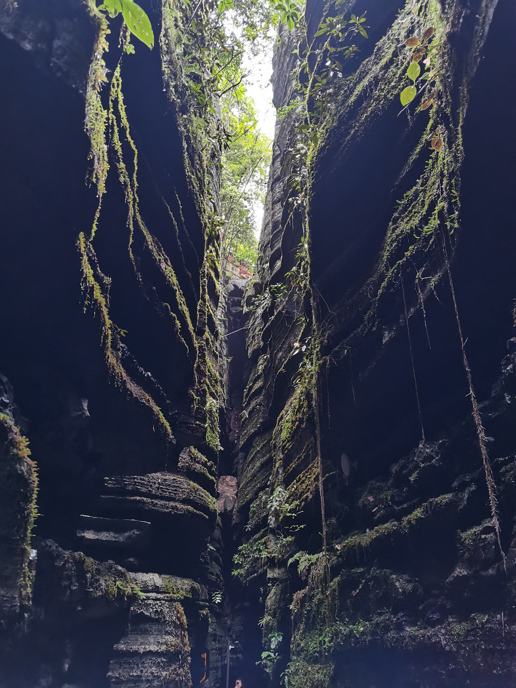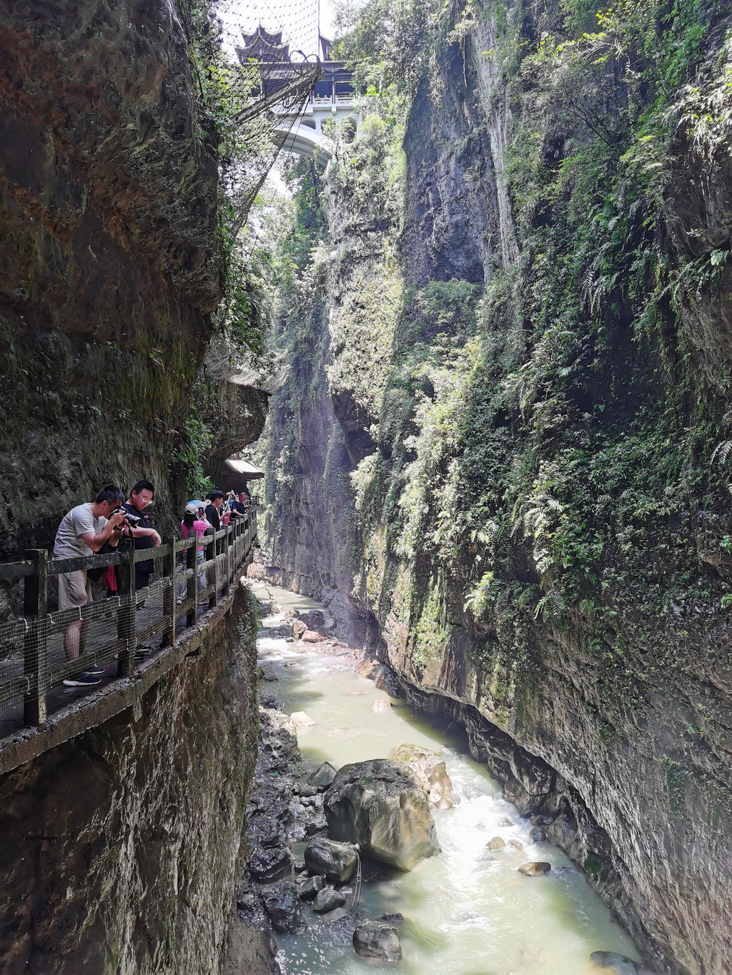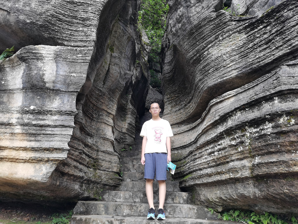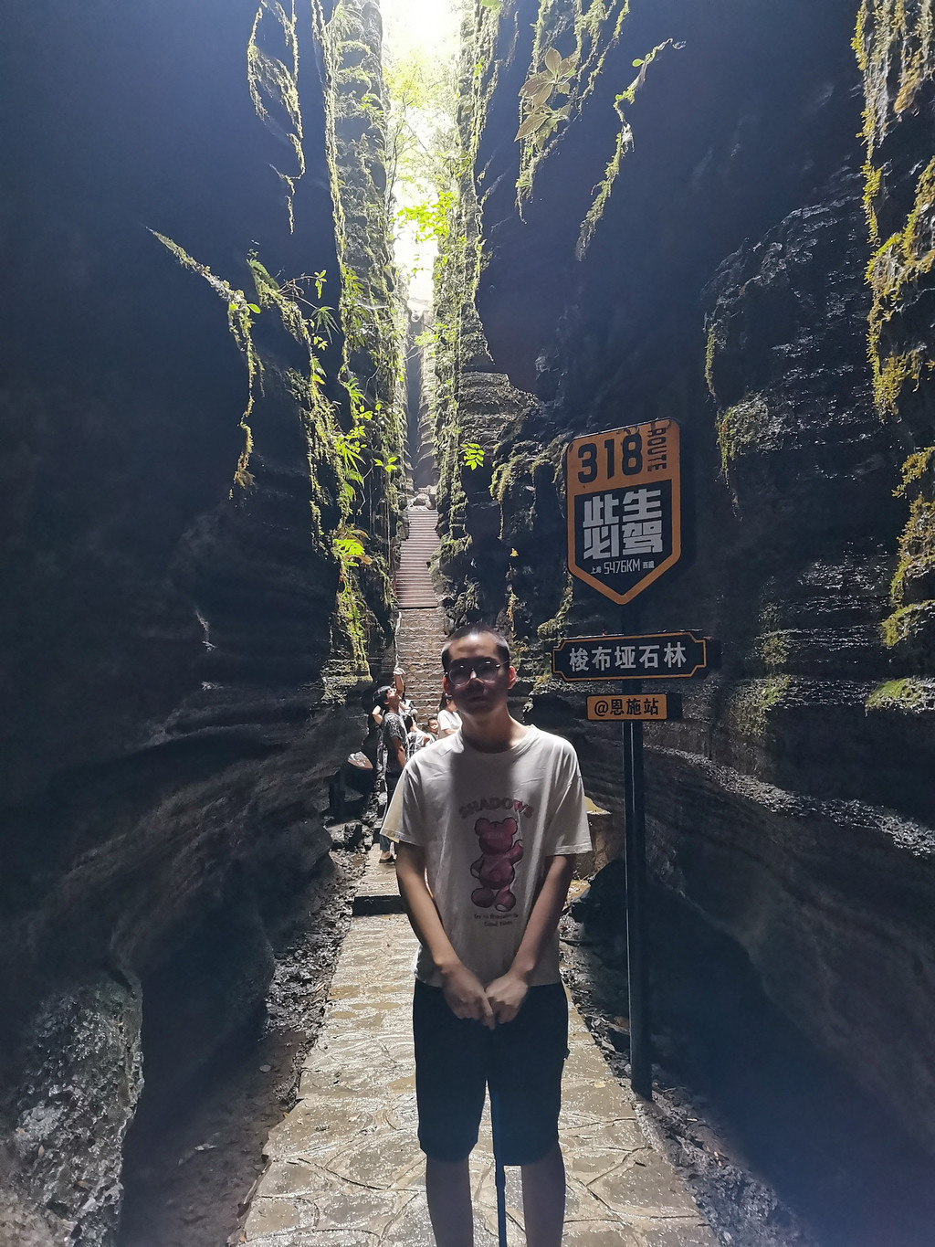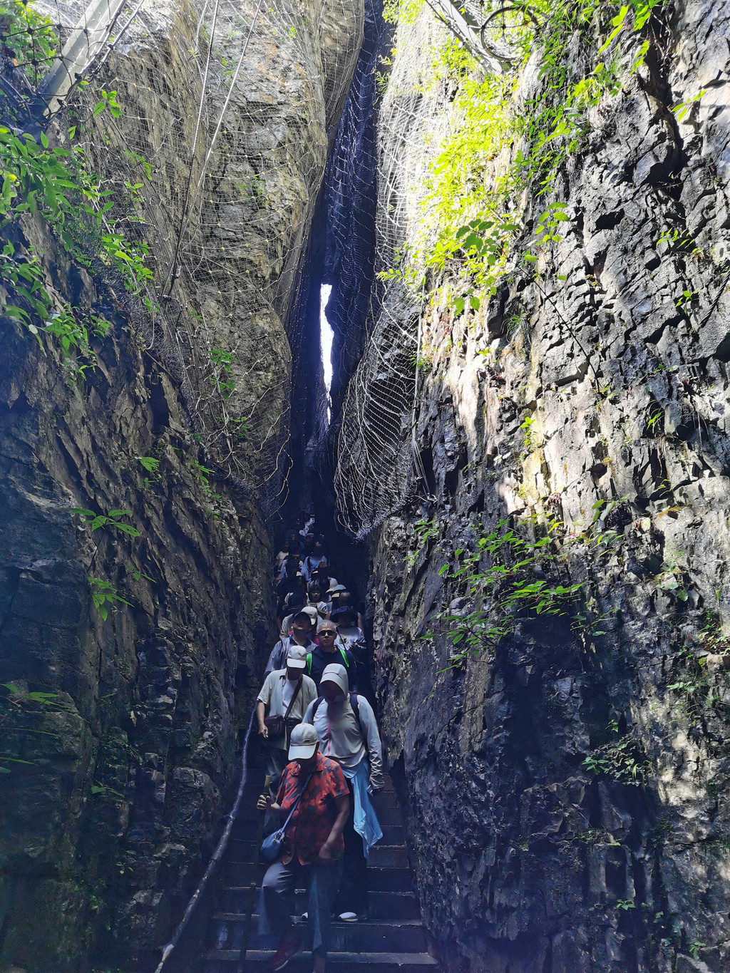 听说地缝走到尽头坐电梯上山顶后,还要在山顶烈日下走二公里才能到达出口,我们走到第三个瀑布后,便原路返回,逆行由入口出。再从索道排队处对面小门出景区,走两三分钟便回到客栈。这样是最最轻松的玩法。我们8点入游客中心,2点出来吃完午饭了。