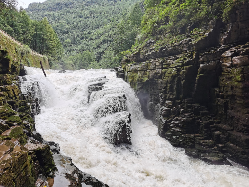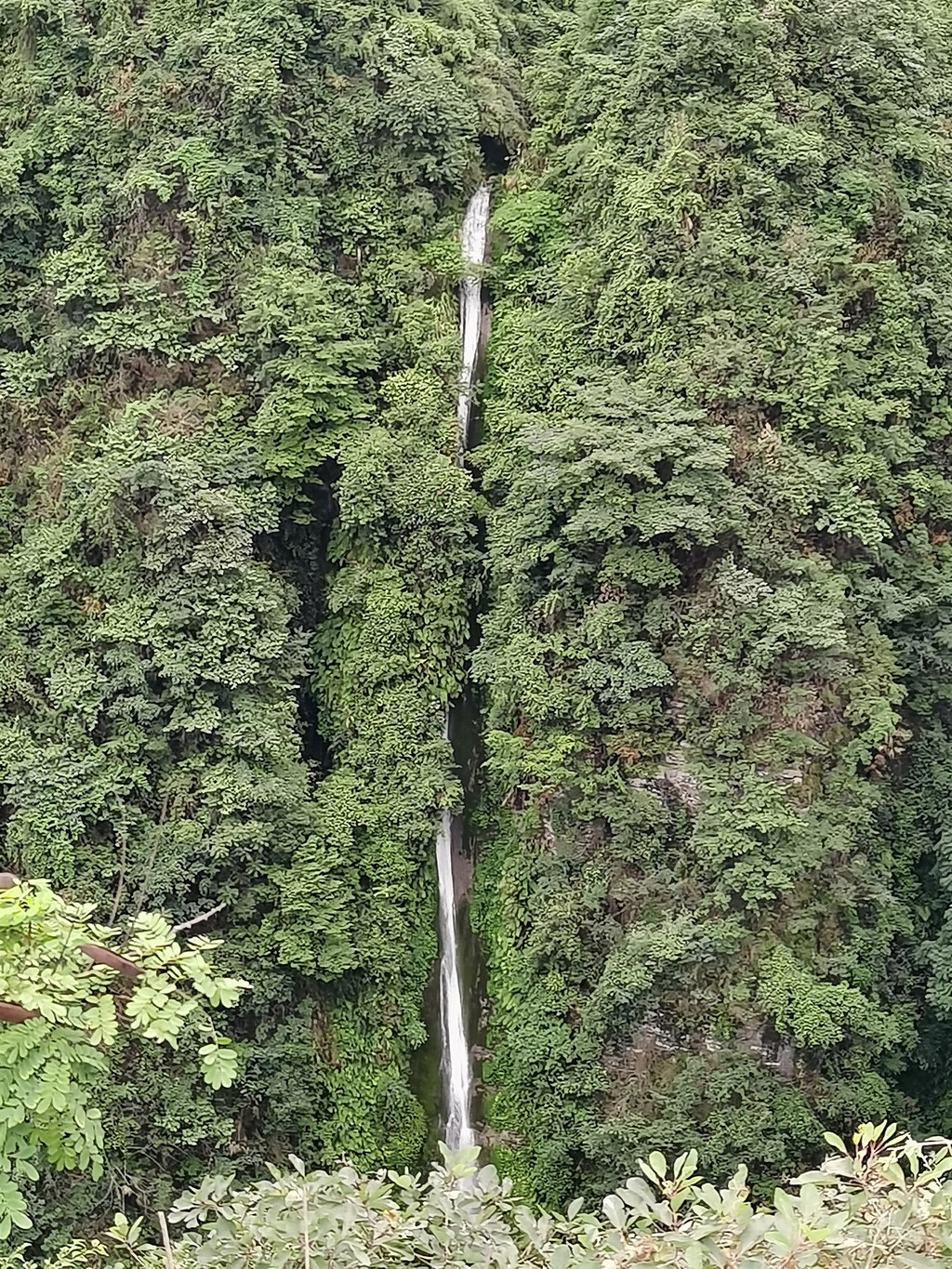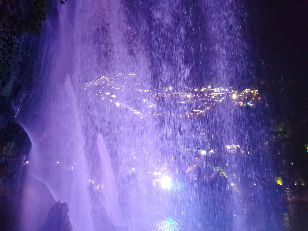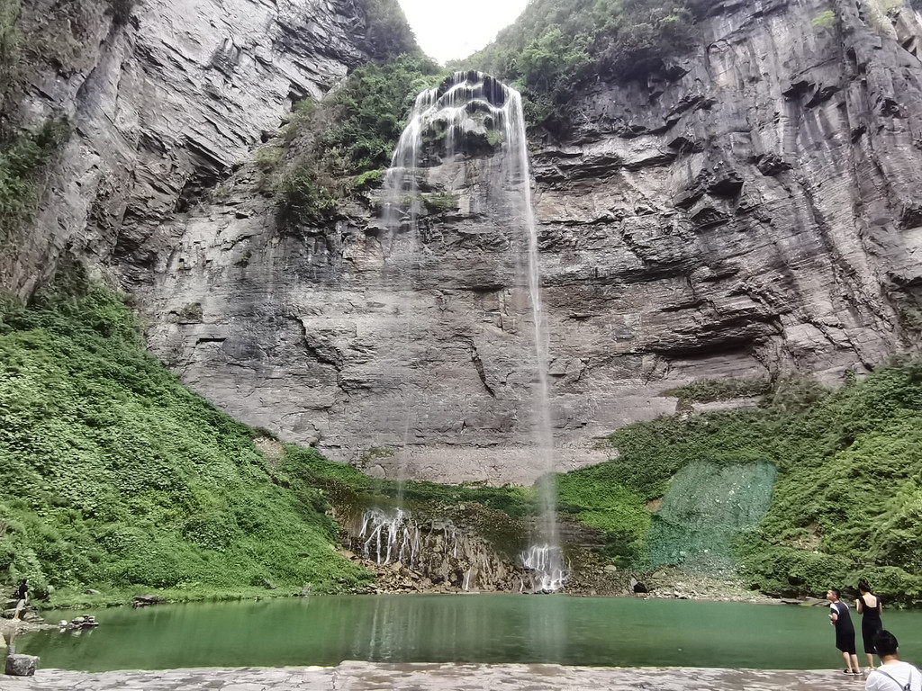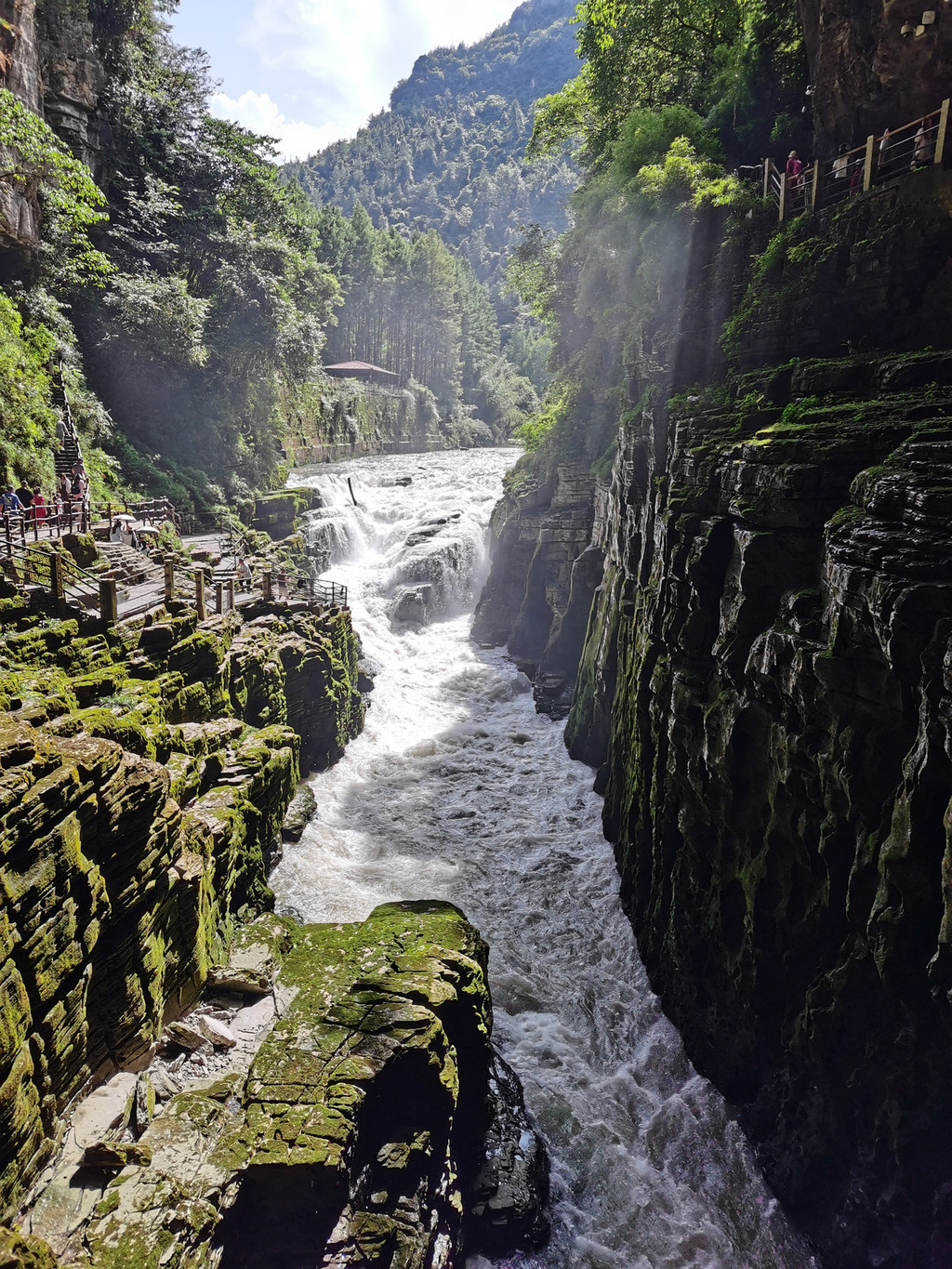 1点到达德夯大峡谷景区。入内便是德夯苗寨,游人不多,较原生态。穿过苗寨坐几分钟观光车,沿溪走十分钟到达流纱瀑布。瀑布高216米,号称国内落差最大瀑布,长年细如轻纱,今天见证奇迹,到达瀑布前,见一条细丝由空中飘落,小到几乎看不见。拍照几分钟,离去,再回首,瀑布突然大了许多。再停留,五分钟后,瀑布倾泻而下,气势磅礴,突然从温文少女变硬朗小伙。