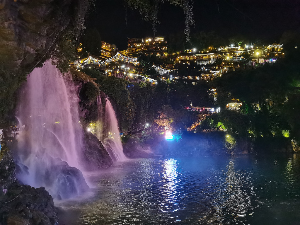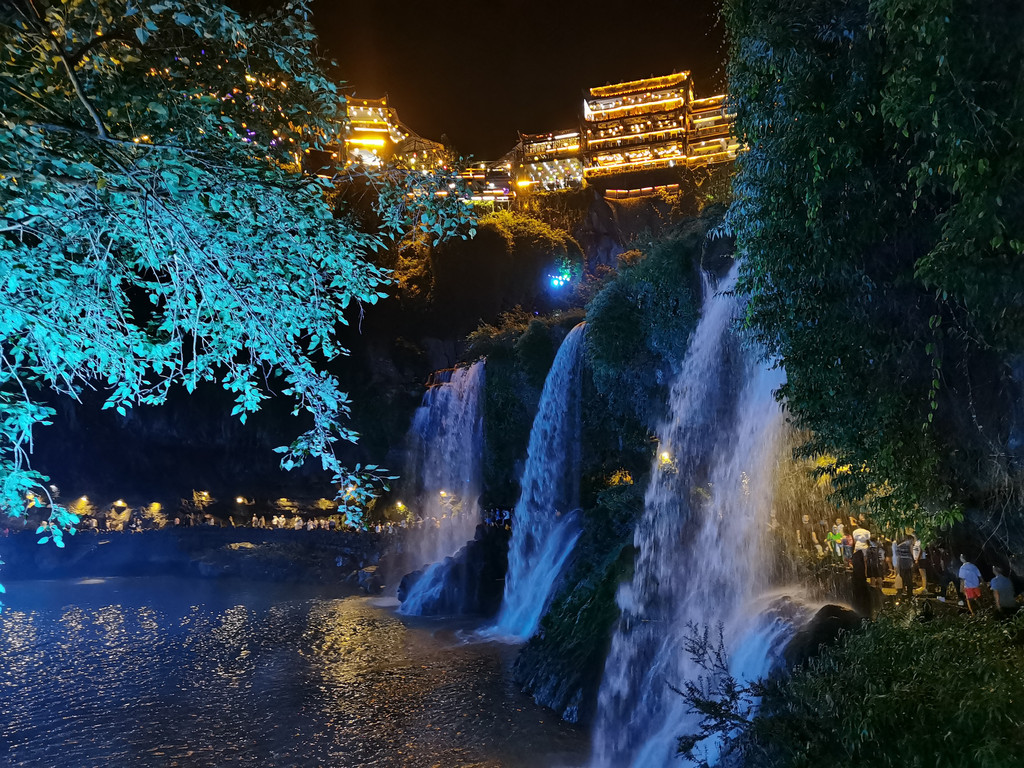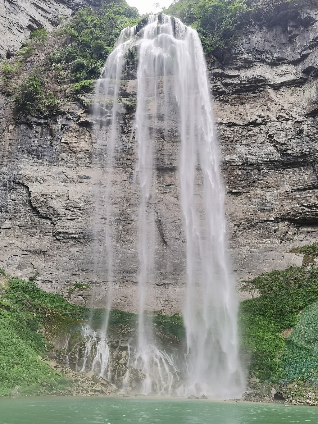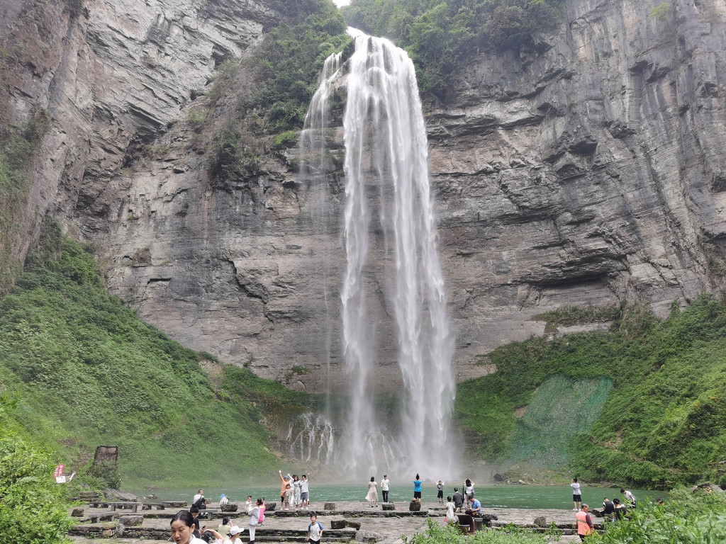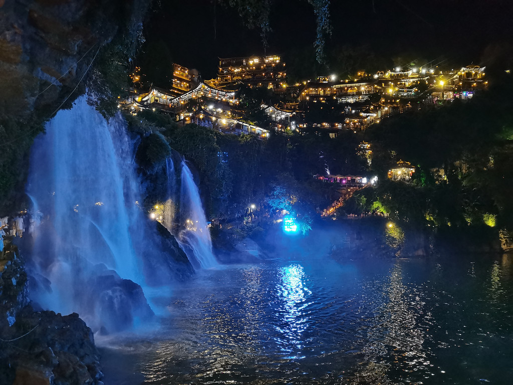 1点到达德夯大峡谷景区。入内便是德夯苗寨,游人不多,较原生态。穿过苗寨坐几分钟观光车,沿溪走十分钟到达流纱瀑布。瀑布高216米,号称国内落差最大瀑布,长年细如轻纱,今天见证奇迹,到达瀑布前,见一条细丝由空中飘落,小到几乎看不见。拍照几分钟,离去,再回首,瀑布突然大了许多。再停留,五分钟后,瀑布倾泻而下,气势磅礴,突然从温文少女变硬朗小伙。