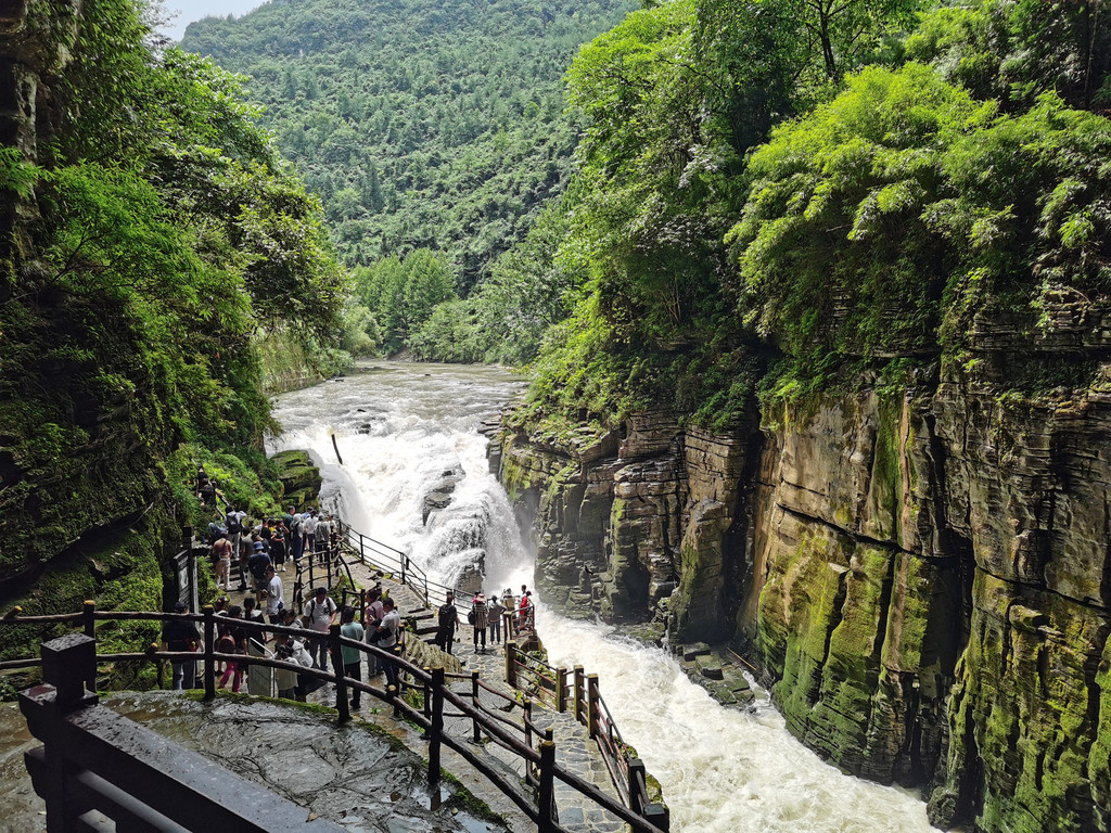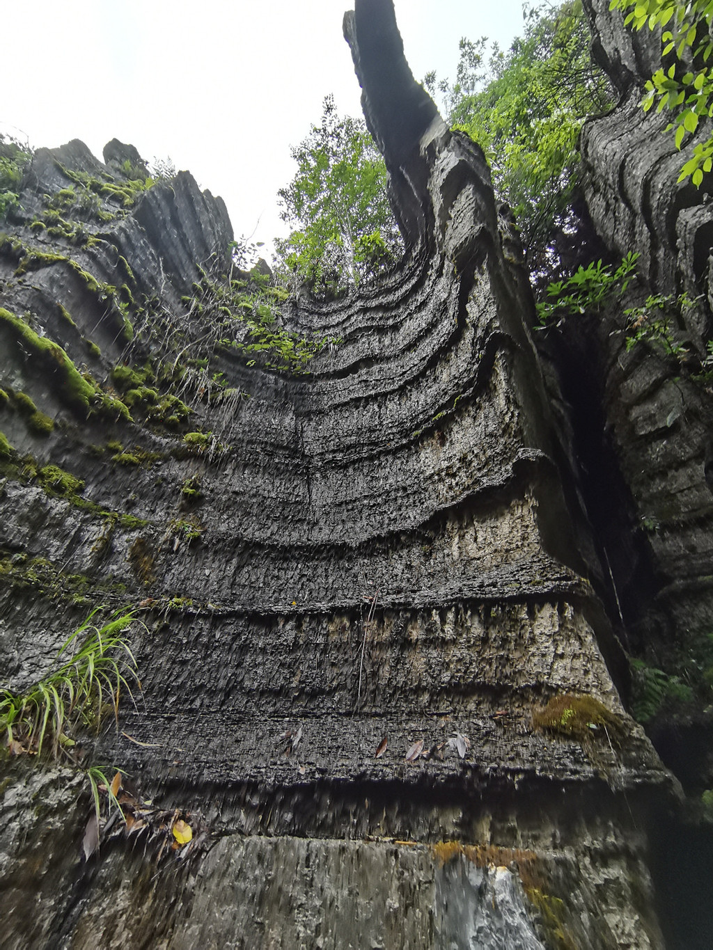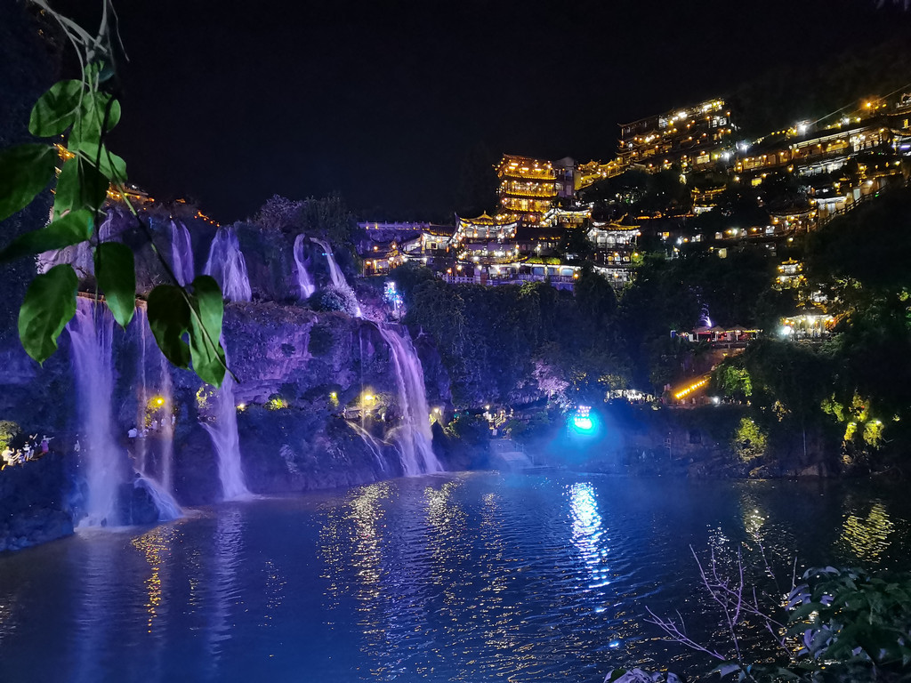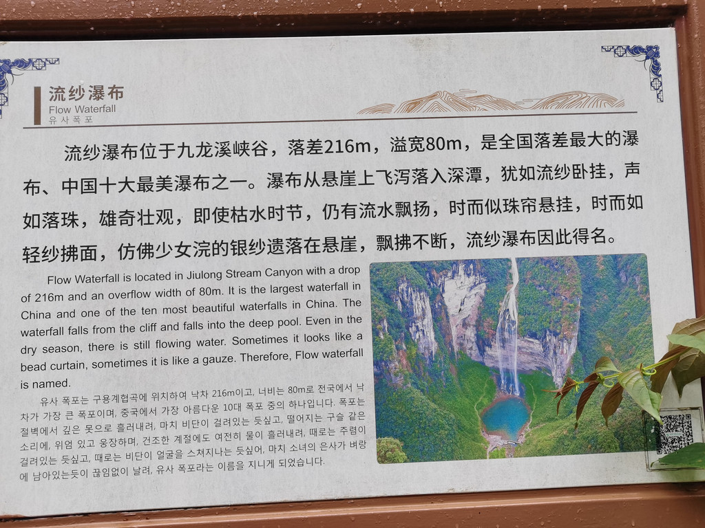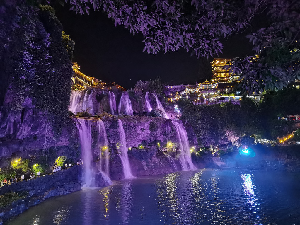 1点到达德夯大峡谷景区。入内便是德夯苗寨,游人不多,较原生态。穿过苗寨坐几分钟观光车,沿溪走十分钟到达流纱瀑布。瀑布高216米,号称国内落差最大瀑布,长年细如轻纱,今天见证奇迹,到达瀑布前,见一条细丝由空中飘落,小到几乎看不见。拍照几分钟,离去,再回首,瀑布突然大了许多。再停留,五分钟后,瀑布倾泻而下,气势磅礴,突然从温文少女变硬朗小伙。