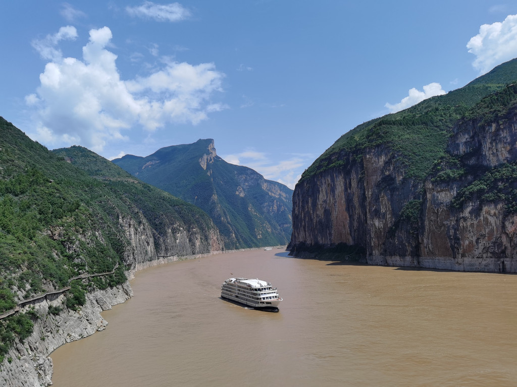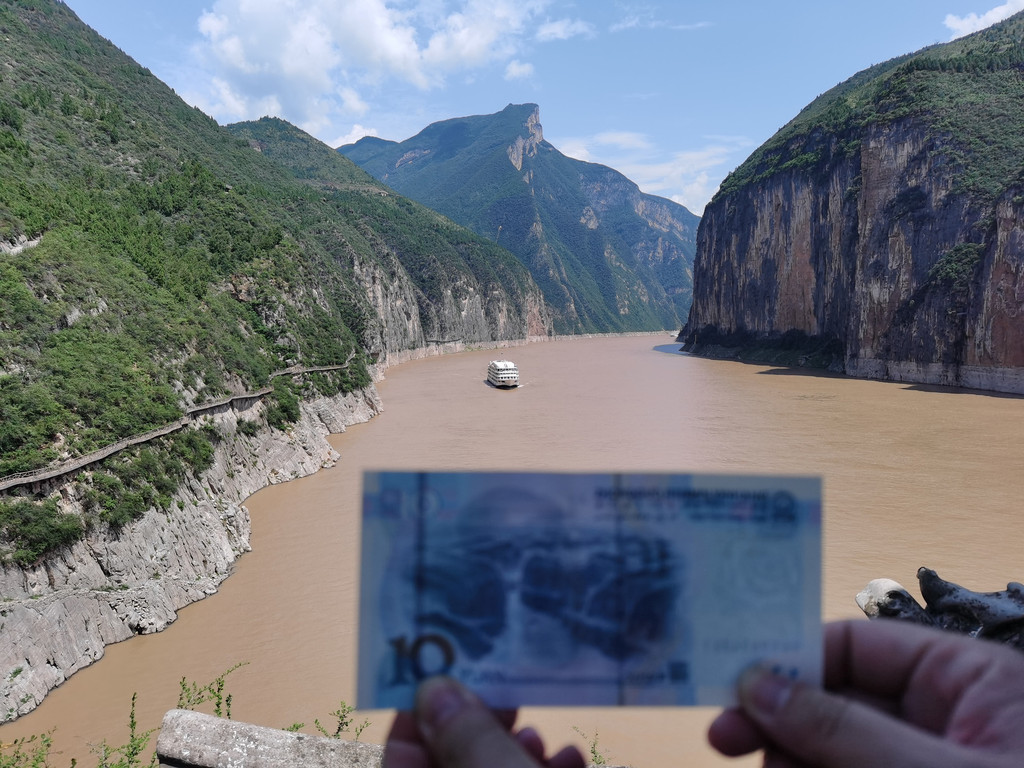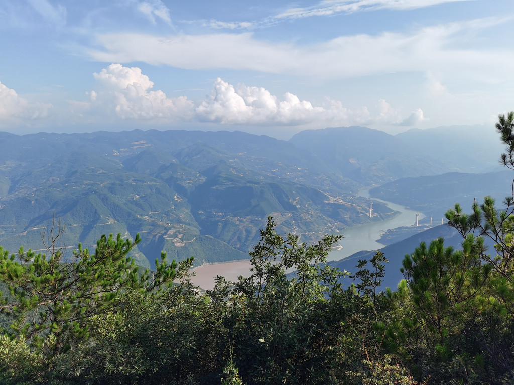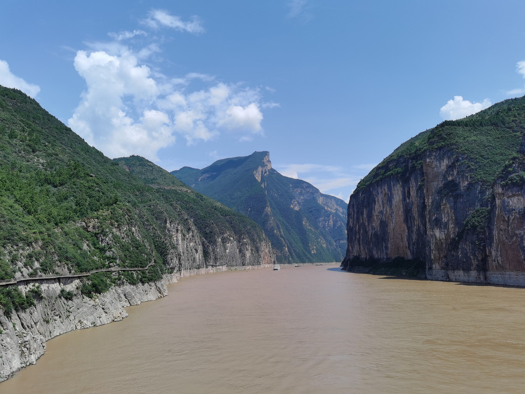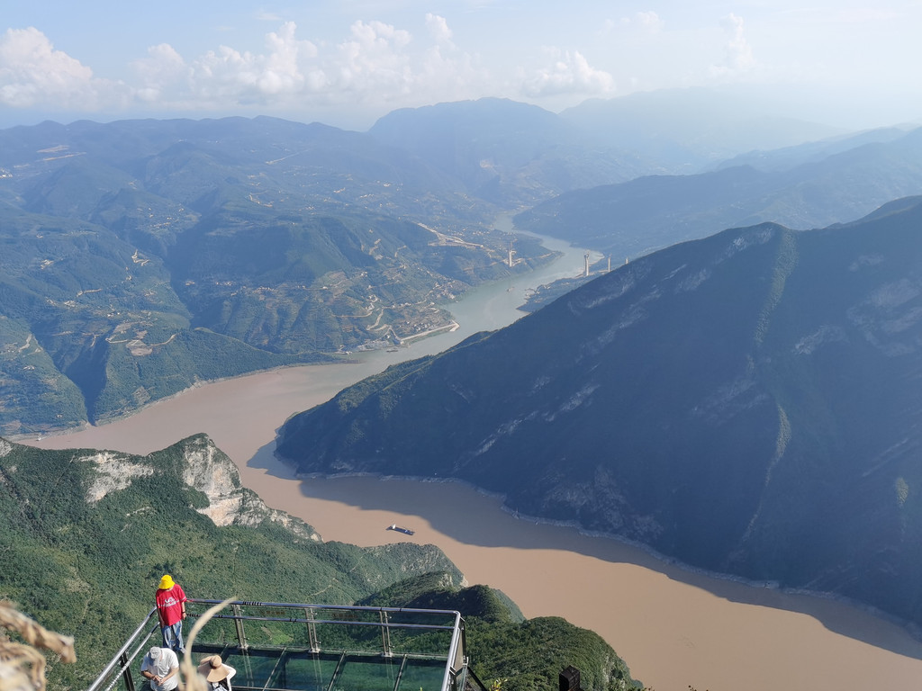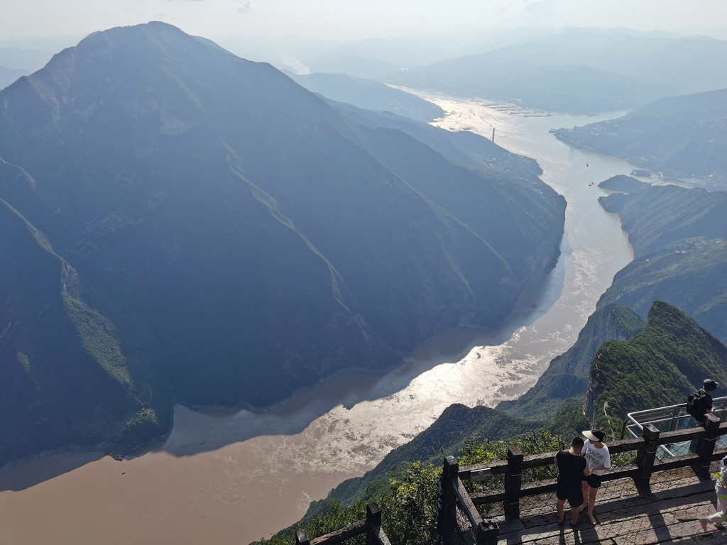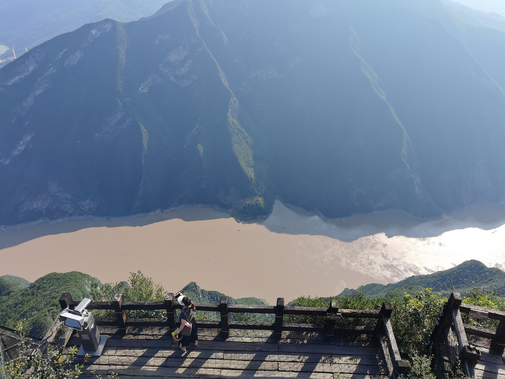 赴三峡之巅,四十分钟到达,景交车上山,走二十分钟到观景台,无多少台阶,基本是平路。观景台视野开阔,一览众山小,俯瞰整个瞿塘峡,雄奇险峻。可惜昨天下了场暴雨,长江变黄河了,要不更秀美几分。