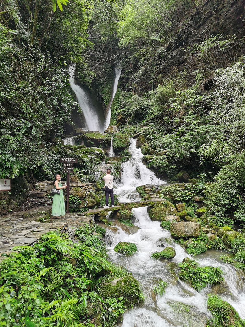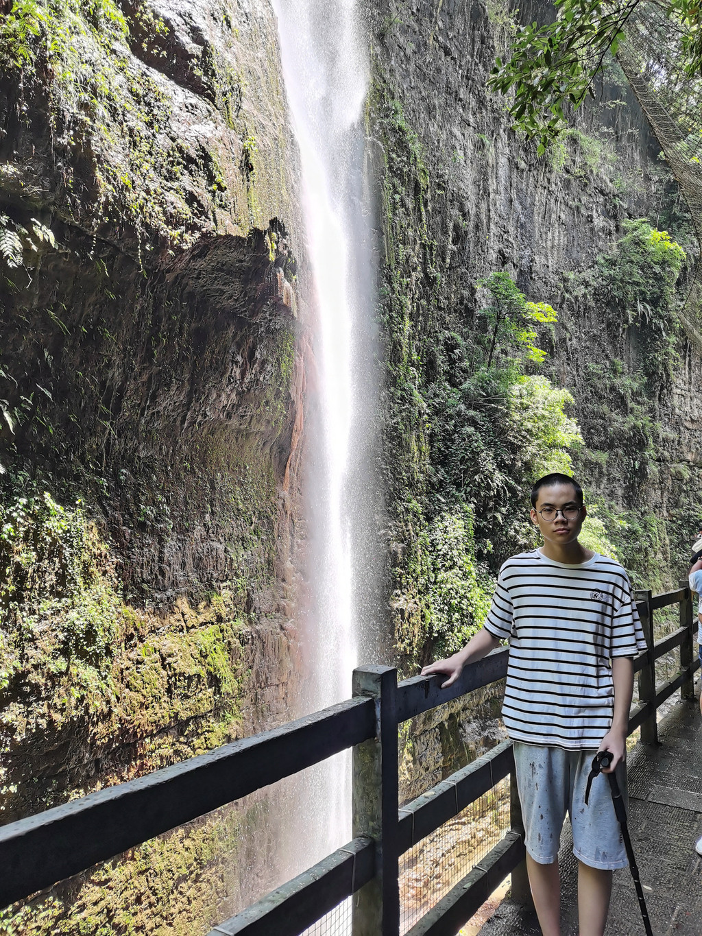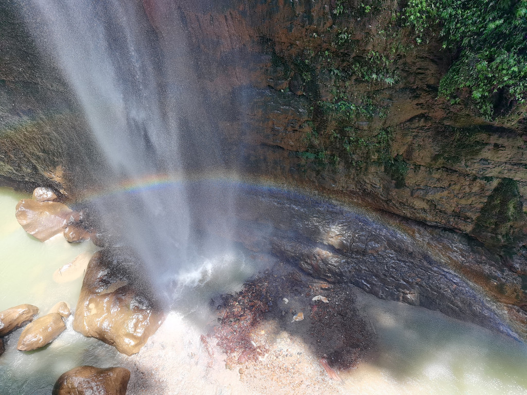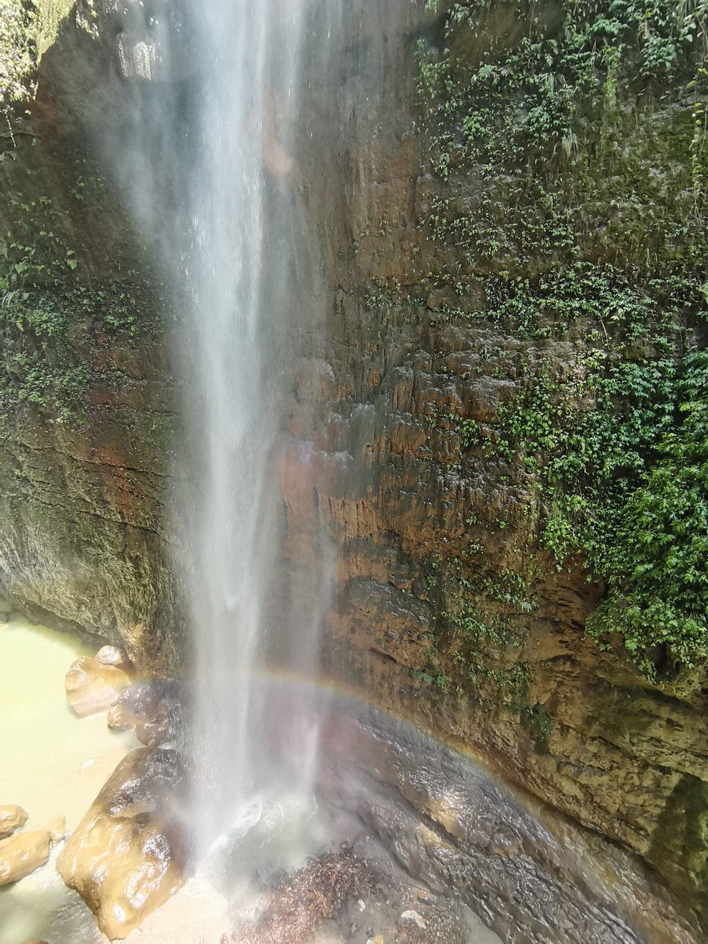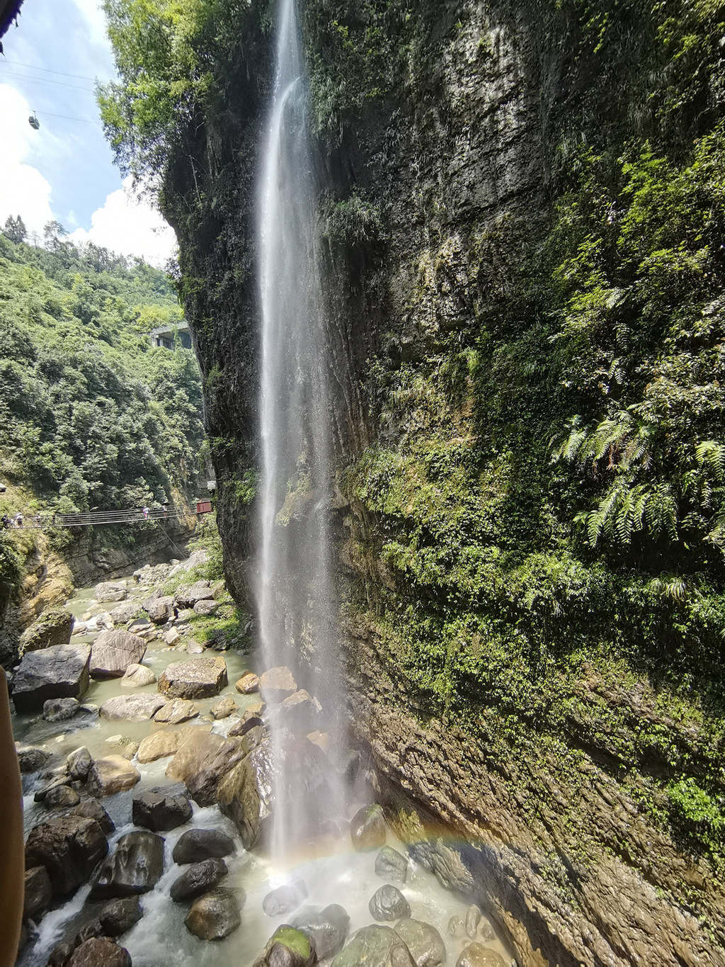 下车走几分钟到达地缝,走一段下山路到达谷底,谷底沿路有泉水飘落,很是清凉。第一条瀑布出现,一条彩虹悬挂在瀑布底部,还是有点惊艳的。个人觉得地缝景色比七星寨好,还不费腿。