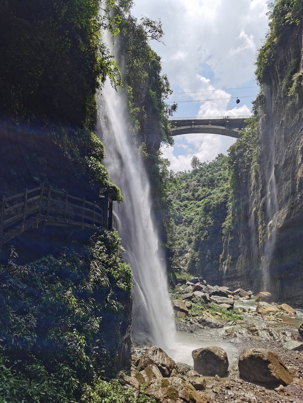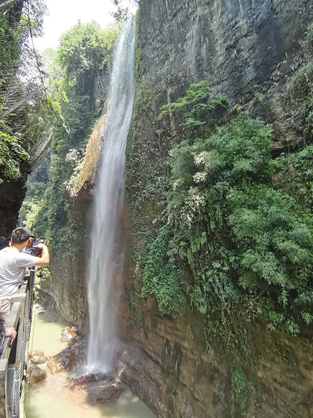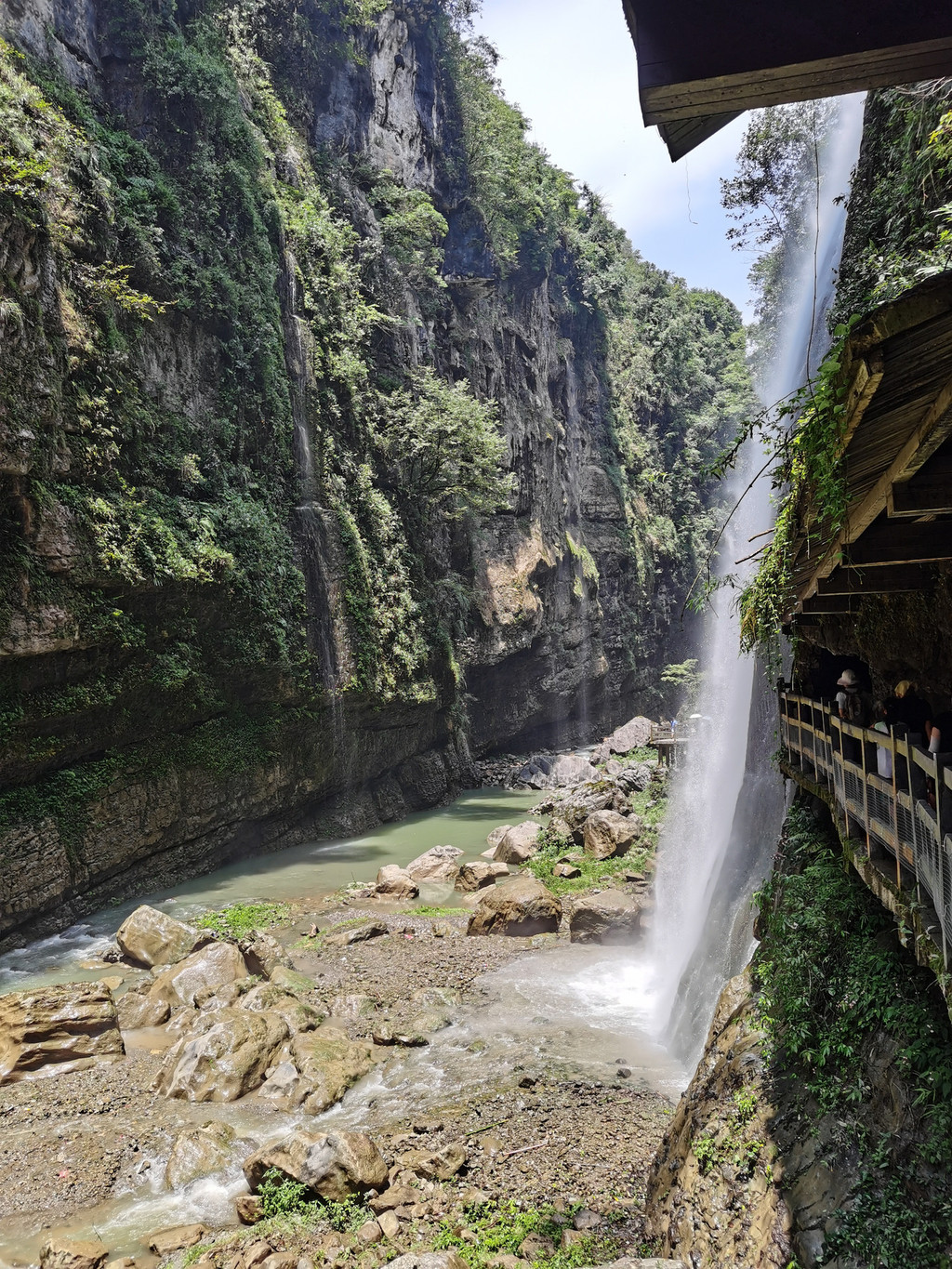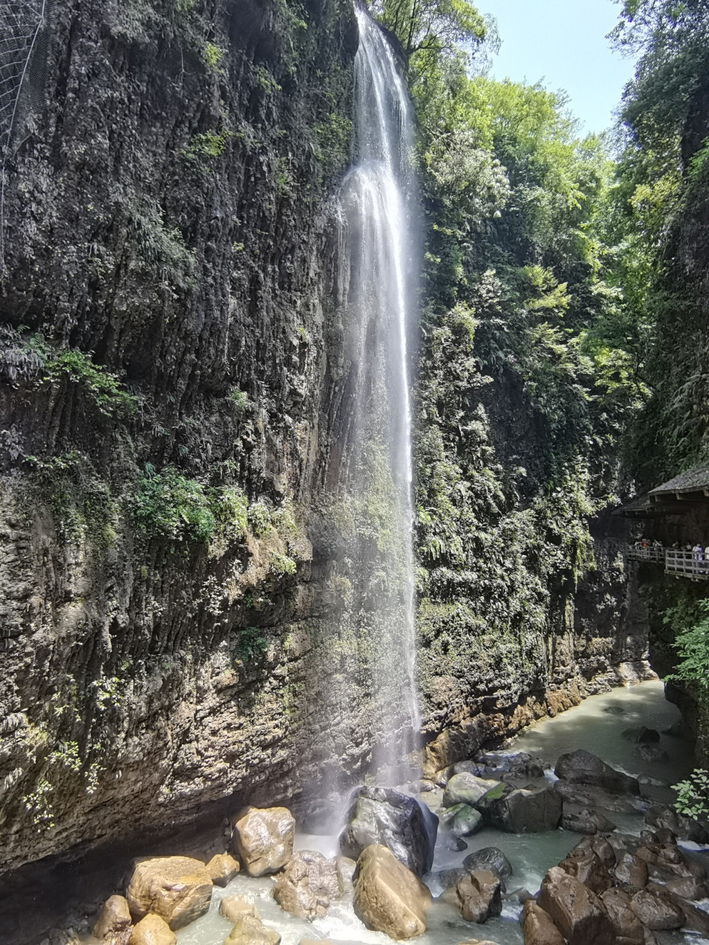 下车走几分钟到达地缝,走一段下山路到达谷底,谷底沿路有泉水飘落,很是清凉。第一条瀑布出现,一条彩虹悬挂在瀑布底部,还是有点惊艳的。个人觉得地缝景色比七星寨好,还不费腿。