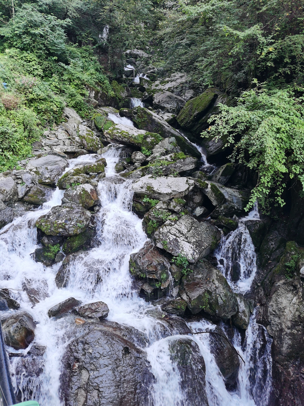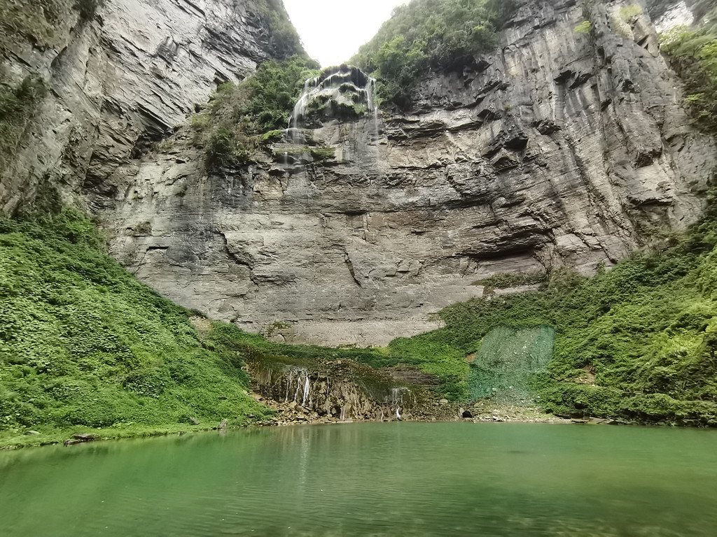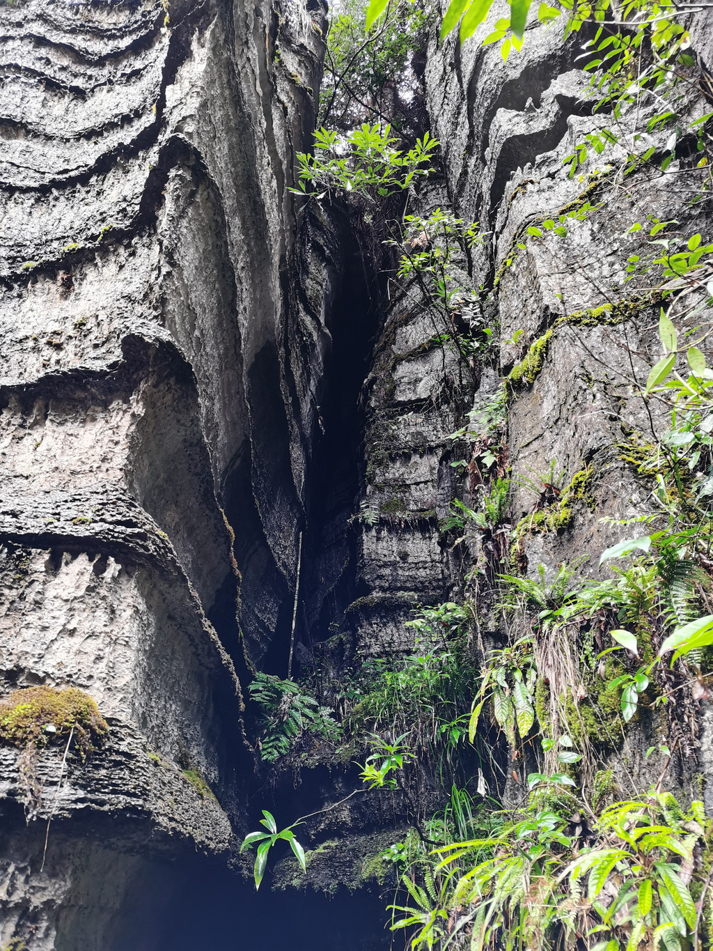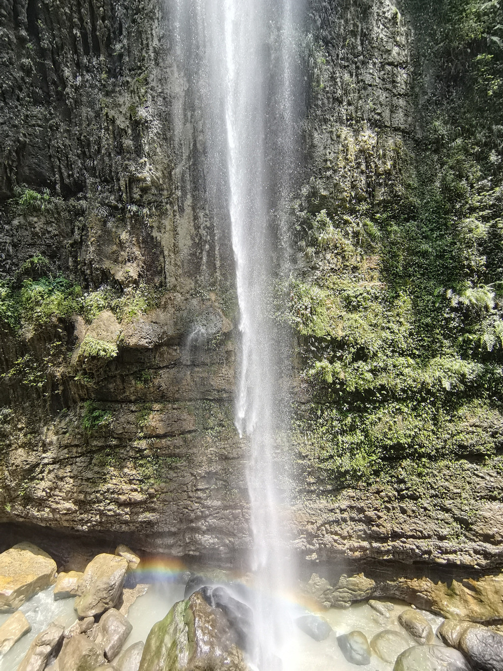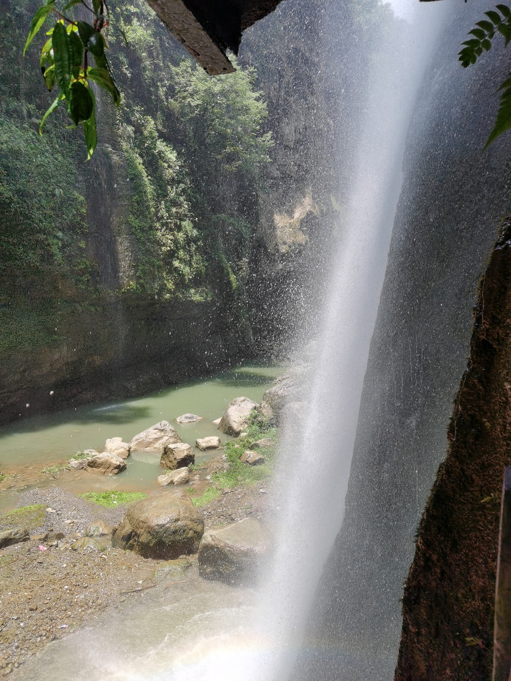 下车走几分钟到达地缝,走一段下山路到达谷底,谷底沿路有泉水飘落,很是清凉。第一条瀑布出现,一条彩虹悬挂在瀑布底部,还是有点惊艳的。个人觉得地缝景色比七星寨好,还不费腿。