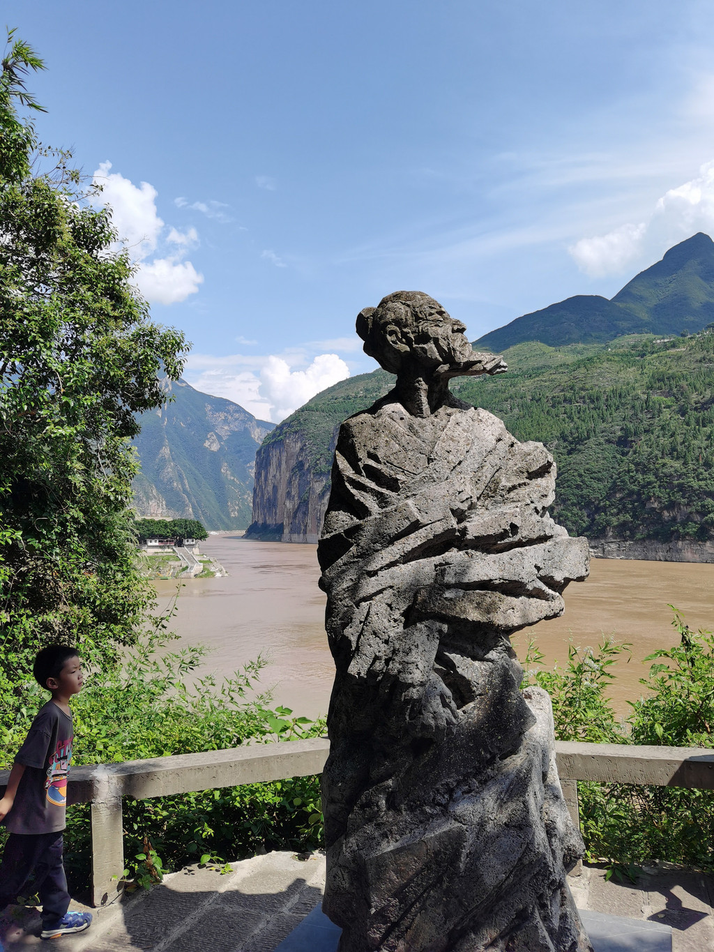 一点到达白帝城瞿塘峡景区,感谢李白,景区8月份凭《长安三万里》门票可免费换票入园,一人节约一百大元。入门直奔码头坐船过对岸,看一小小的移民记念馆,再到赤甲楼,这里是观看夔门的最佳位置,下楼到江边有很多野生猴子。原路返回上山顶观白帝庙,山不高,十分钟即到。景区不大,用时二个半小时。