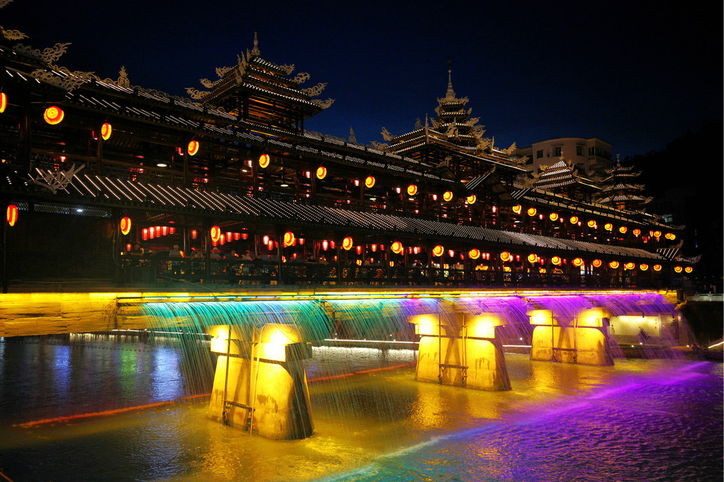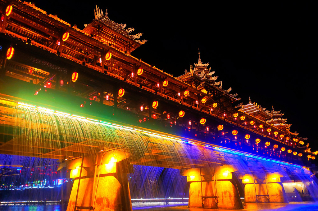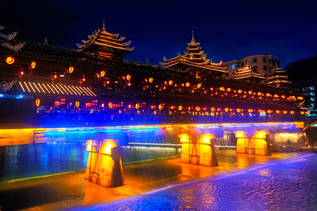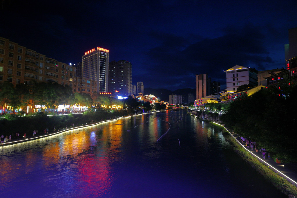 入夜的宣恩,越夜越美丽,是一座不眠的城市。在风光旖旎的贡水河畔,明亮的光束在夜色中描绘出了一幅浪漫的璀璨长卷,平静的河水倒映着岸边亭台楼宇的光线,组合丰富的灯光展示出斑斓色彩,让水型变化更加灵动。
