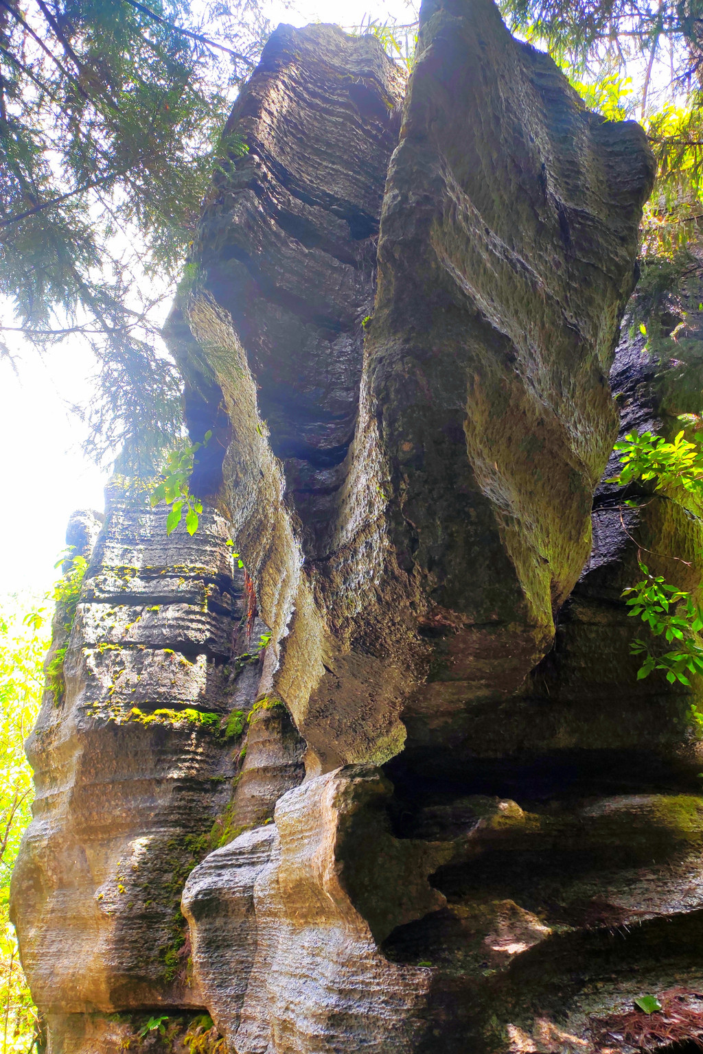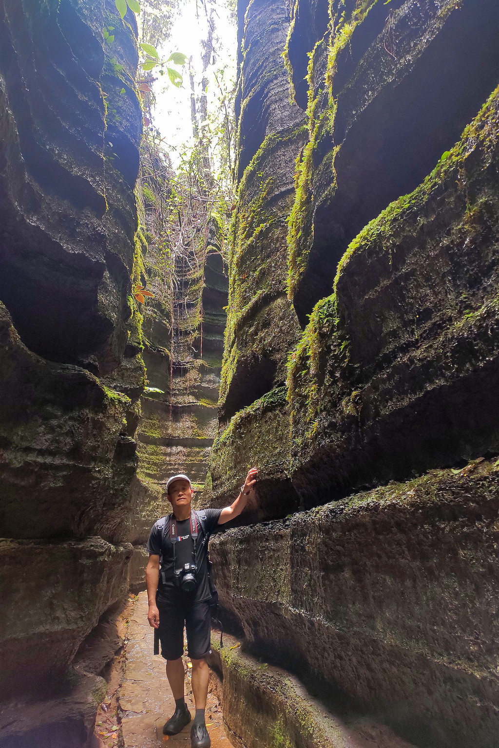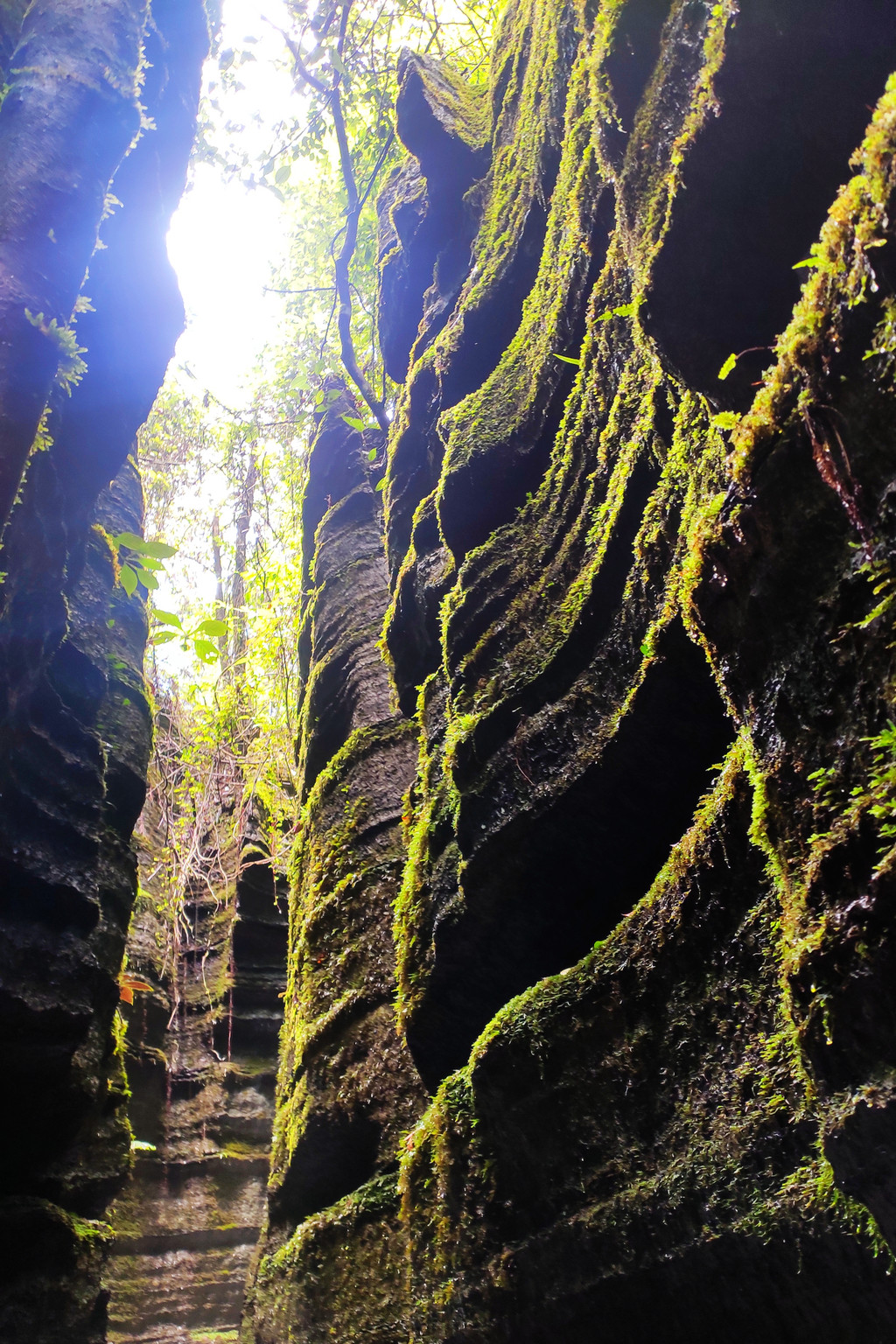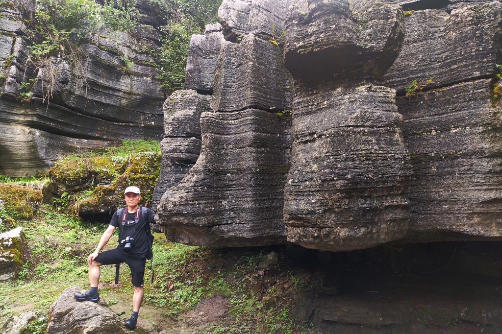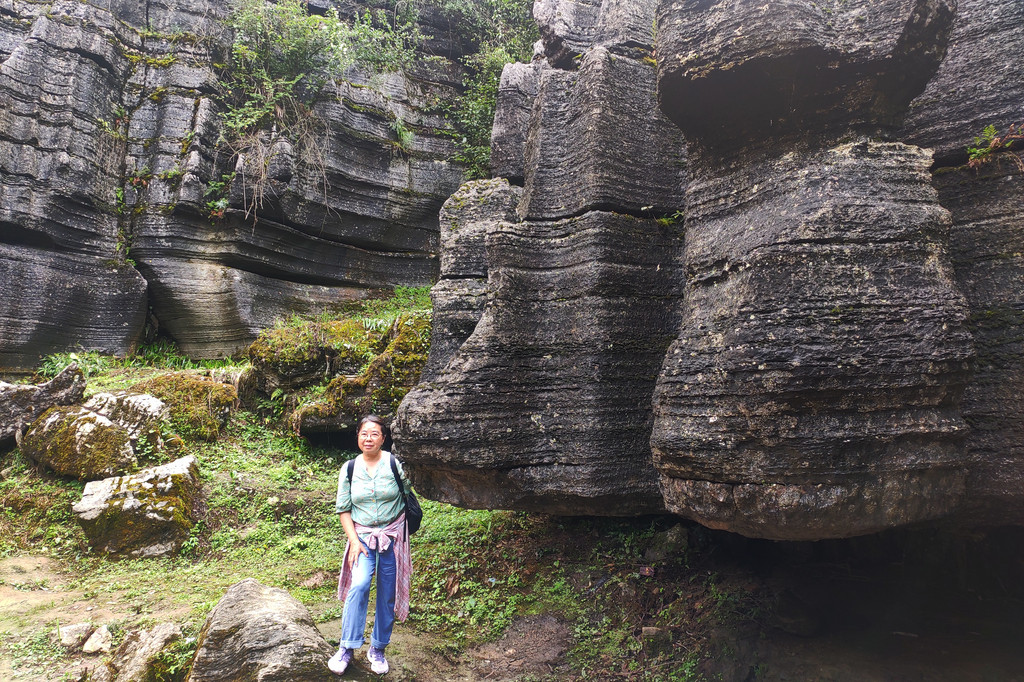 梭布垭石林奇就奇在一圈圈的石棱,一瓣瓣的石柱,上面长满青苔,许多地方狭窄逼仄,只能一人通行。