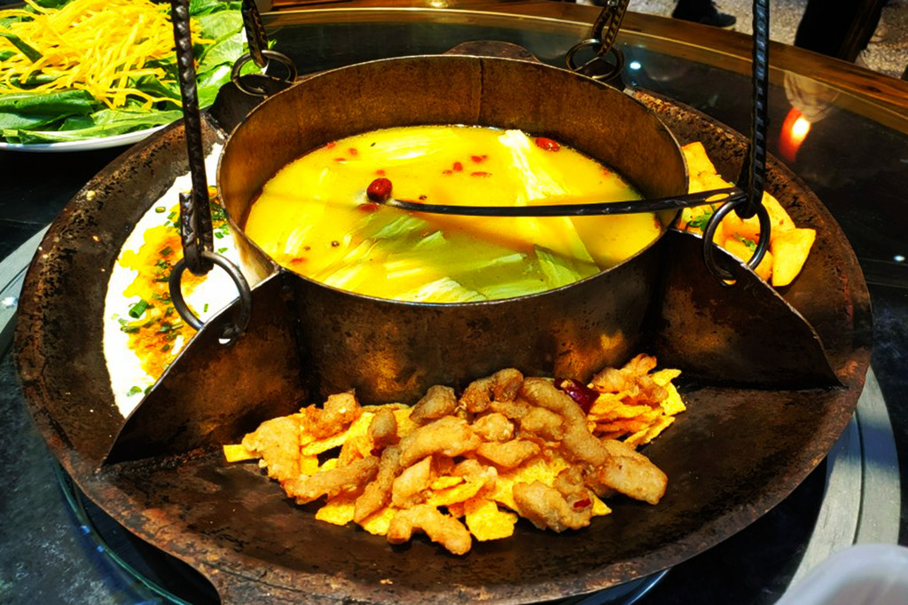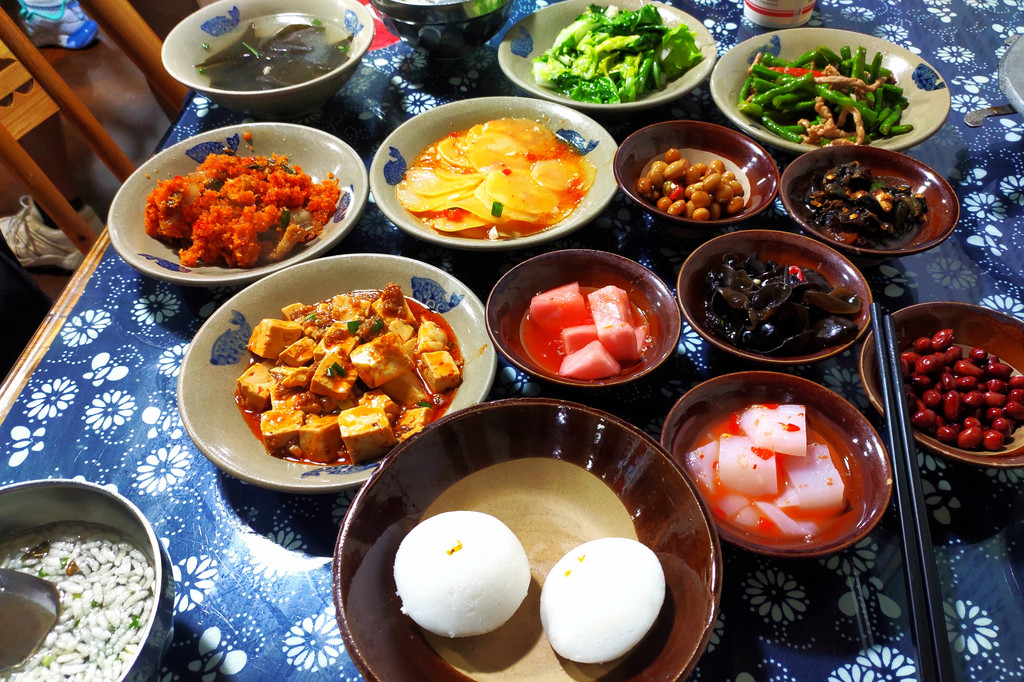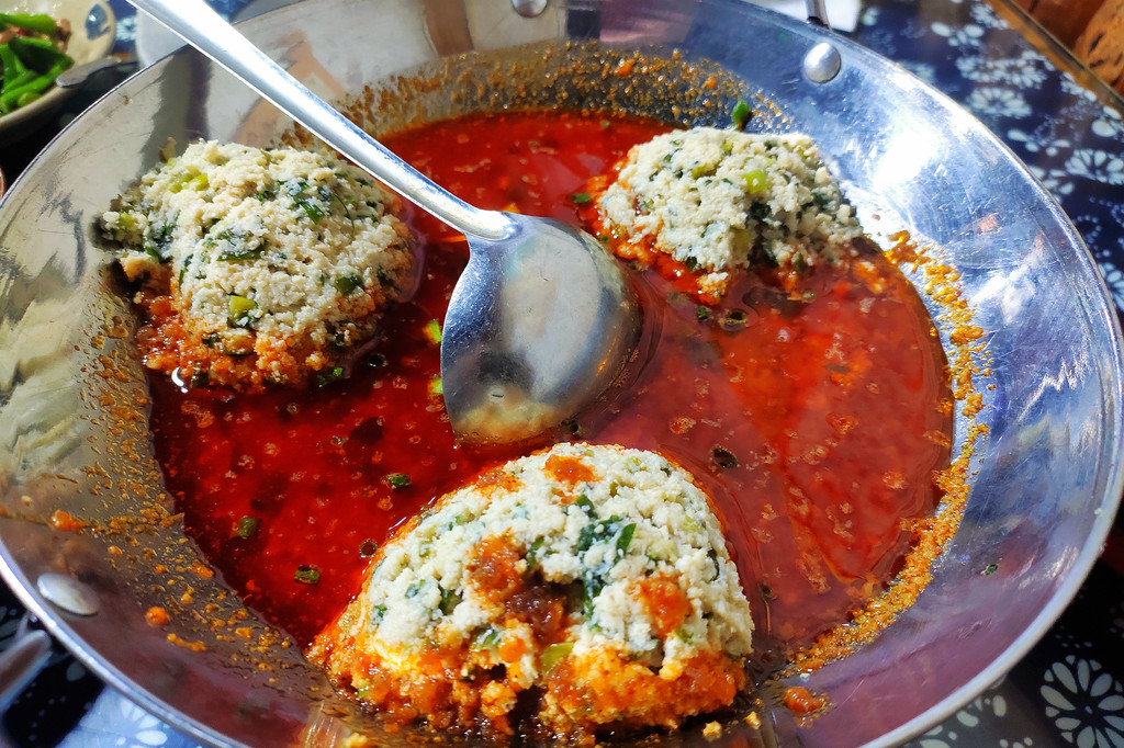 合渣也用小火炖着,也属于赠送的菜品。合渣是恩施的一大特色,用磨豆浆剩下的豆渣做成,混合肉末和辣椒红汤,撒上葱花,比较入味,是我吃过最好吃的豆腐渣。