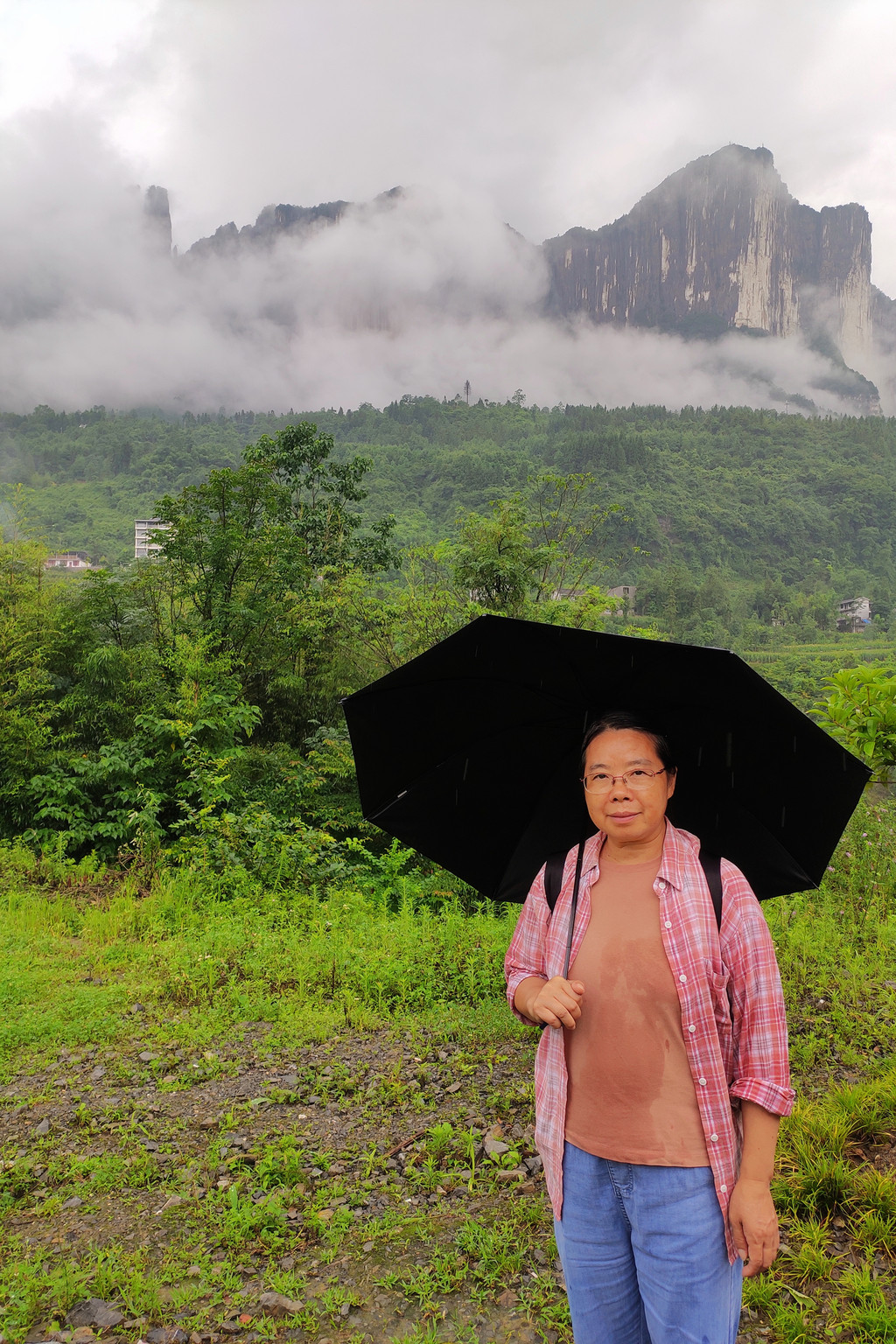 从玻璃桥出来后,就是一段长长的栈道,随后开始顺台阶急下,由于天空雨水不断,加上山体瀑布的溅水,不得不撑起雨伞遮挡。