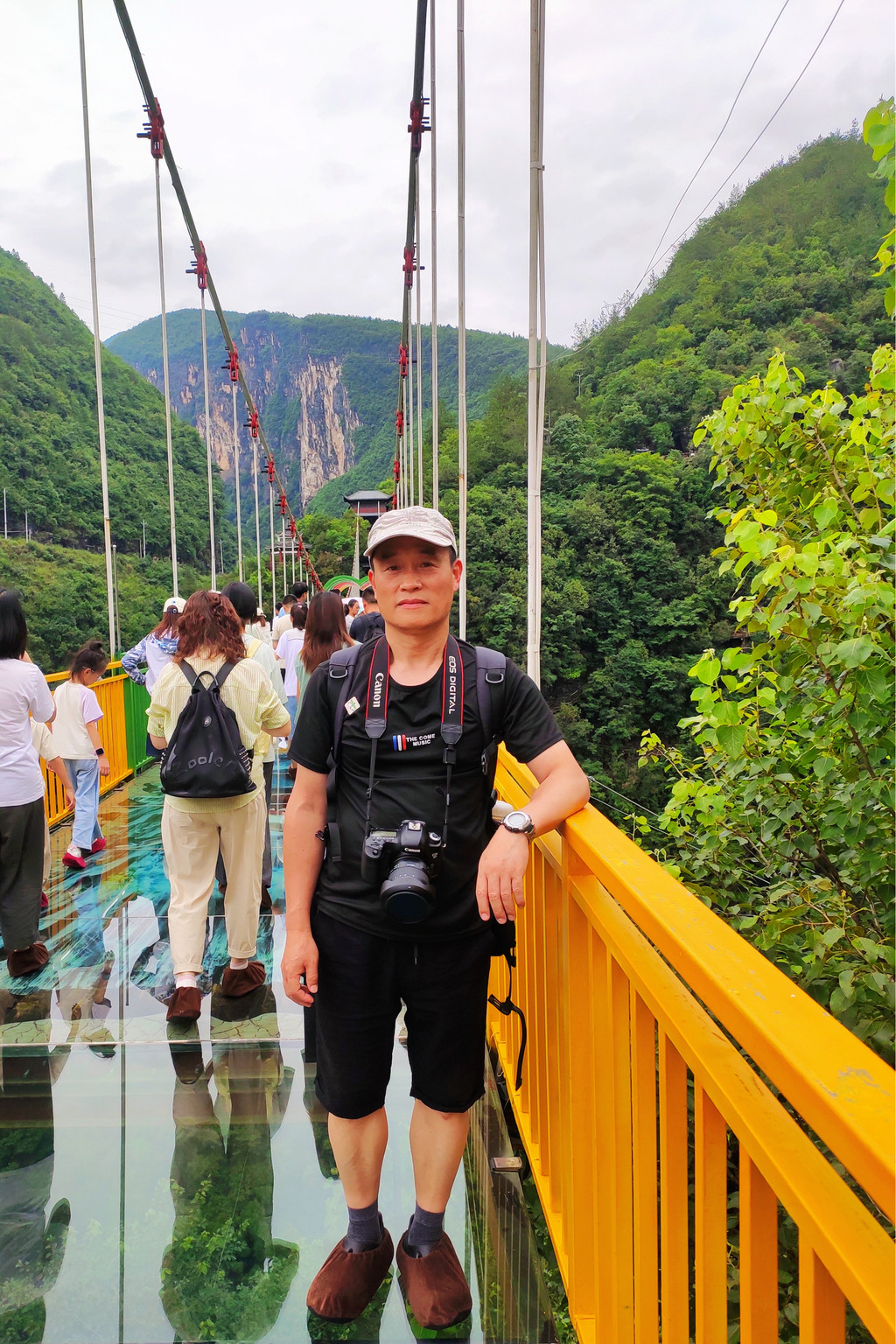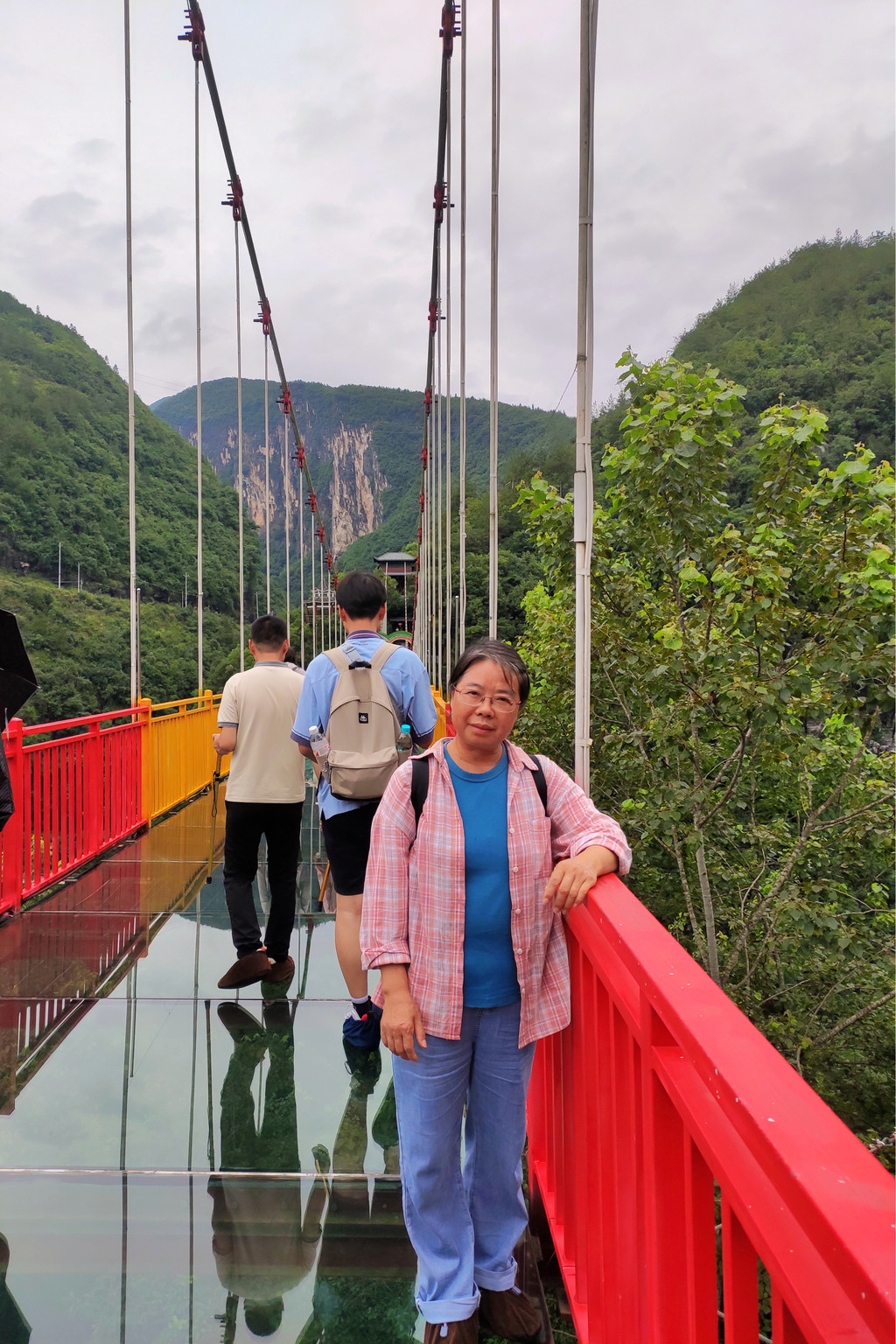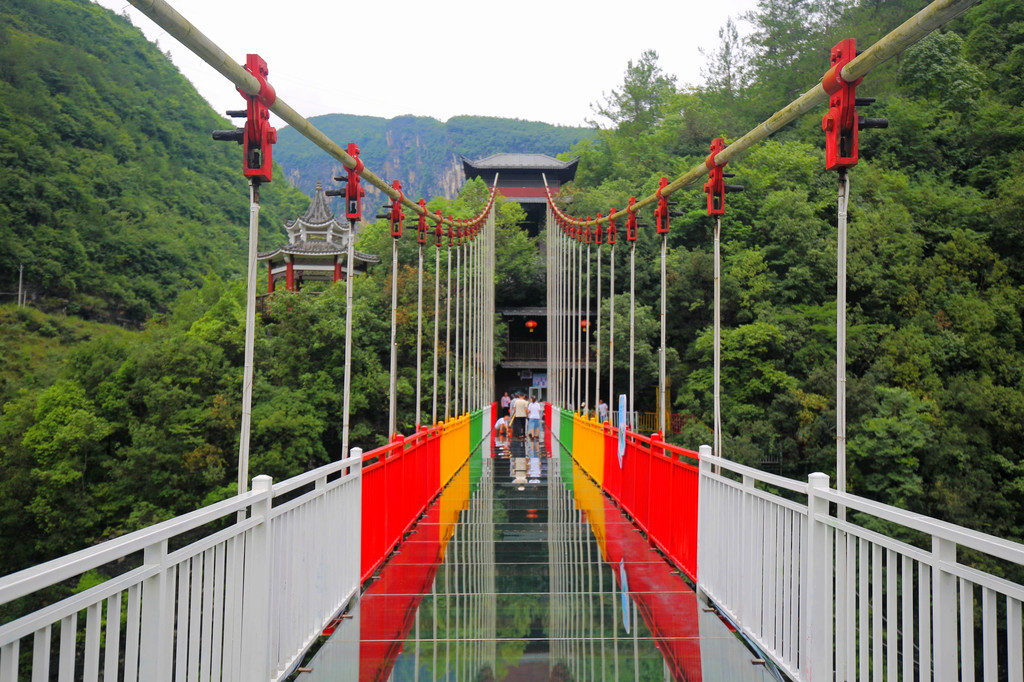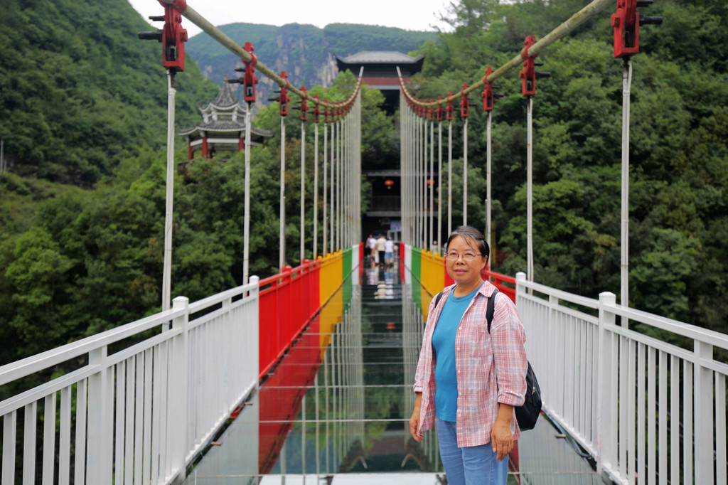 走过花70元人民币体验的号称9D的玻璃桥,位于地心谷景区峡谷绝壁之间。桥长268米,桥面宽3.2米,桥面离河谷高约200米。所谓9D就是桥面加了动态显示画面,增加了玻璃破碎的画面和声音,不过看起来一眼假,意思不大,不过可以节约从浮桥走过来的一小段路,对腿已经报废的我们来说,能够节约哪怕一点点路程都是值得的。
